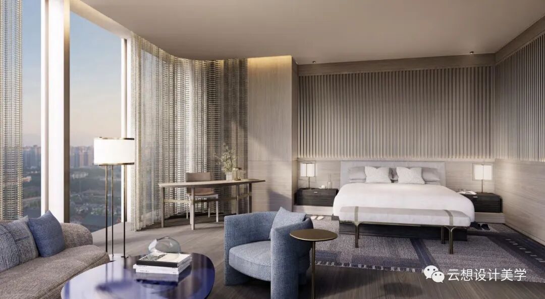 与曲江玫瑰园一母同胞的W酒店相距不远,备受瞩目的奢牌酒店位于项目主塔楼的34-51F,其中3-33F已设定为服务式公寓。围绕266米的曲江新高度,长期以来的缜密工作也告一段落,除酒店设计基本敲定外,整个曲江云松间的面孔逐渐清晰。