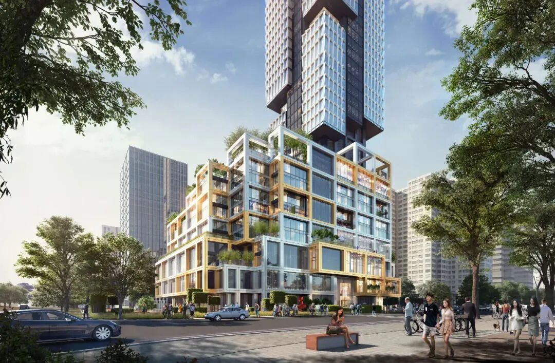意外的是,高空塔楼承担着未来生活居住空间的职能,对应着当代年轻人对高端生活品质的诉求;裙楼的酒店和商业部分,则如同像素块的堆叠伸展,向四面八方展示与众不同的个性面孔,迎合社区在商业、办公生活方面的消费需求。