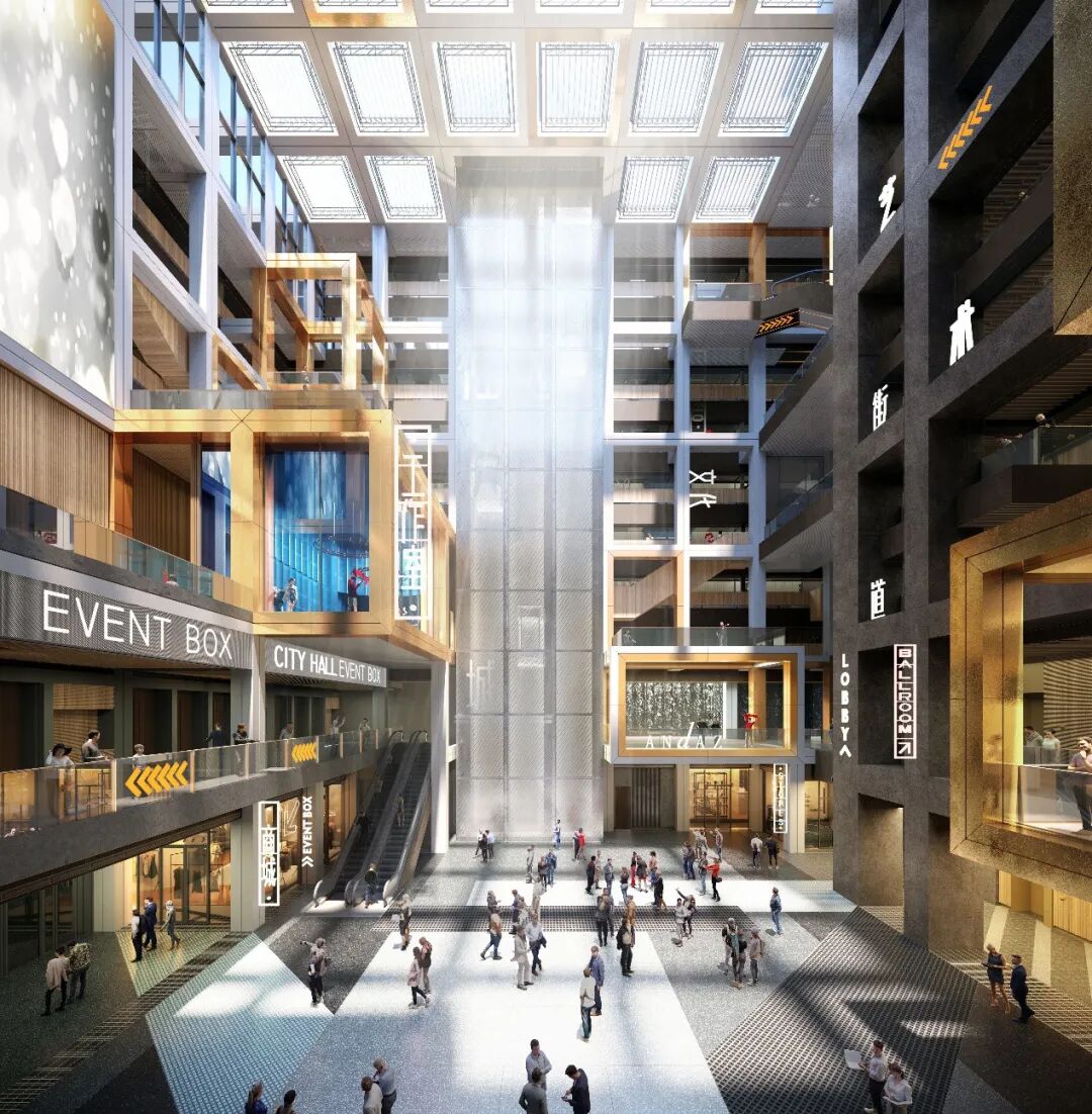 作为一个服务文化、商业和酒店活动等功能的弹性空间,从一楼中庭向上,配套组团分别沿四周螺旋上升布置,通过时空的镜像与对望,能感受到到城与楼的相互交错。