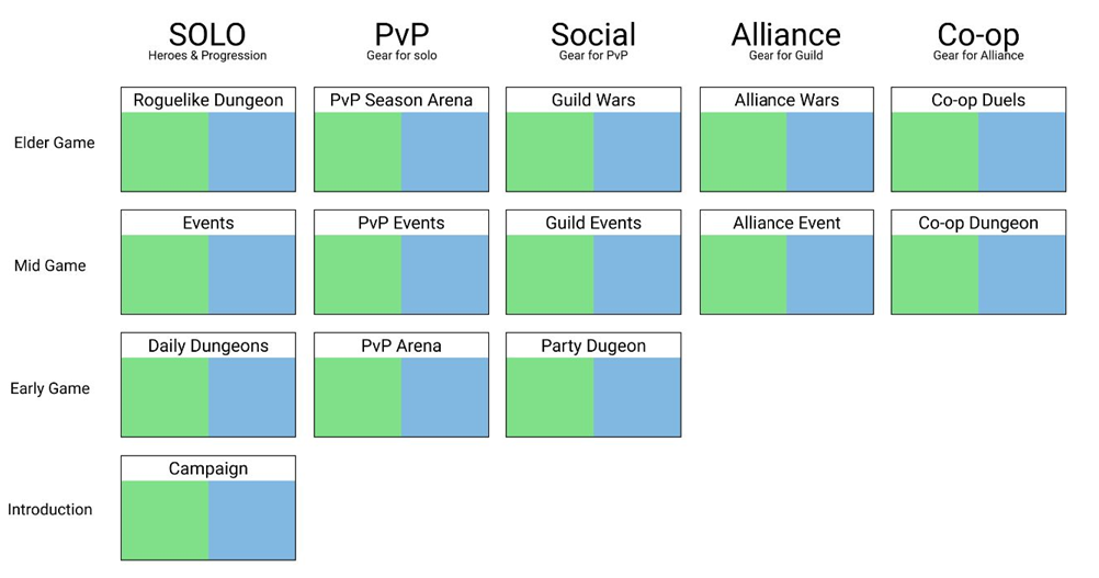 回顾过去总结出游戏的基本的活动设计框架。首先是SOLO部分,包括基本关卡活动(campaign),日常打怪任务(Daily Dungeons),PVE事件,高阶打怪任务(RogueLike Dungeon)等。然后,需要设计各种PVP活动,通常包括PVP竞技场、PVP事件等。PVP竞技赛季是为了让游戏中的最好的玩家脱颖而出。提升社交体验,参加公会的玩家可以参与公会活动,联赛,联盟活动、联盟战争和Co-op活动等。