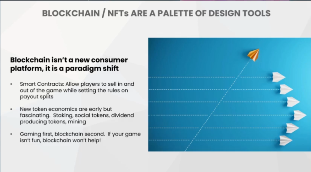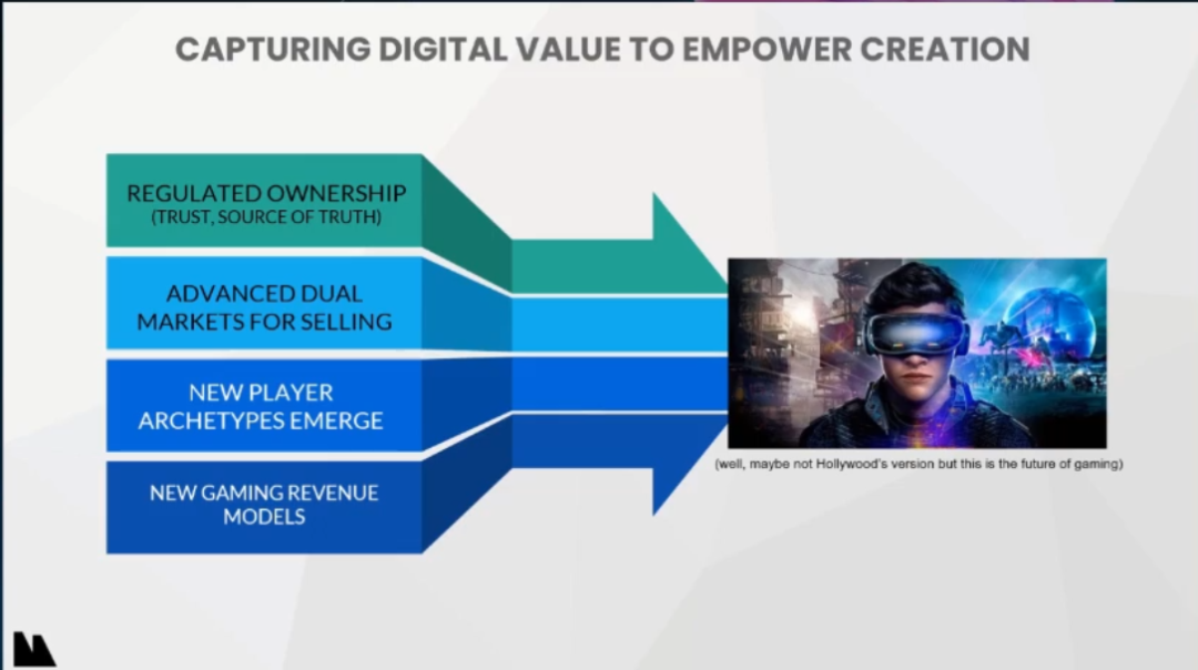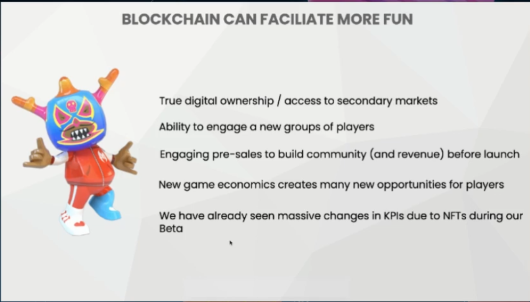 智能合同。区块链技术使得参与者可以在游戏内外自由交易,并可以透明地设置分成规则。