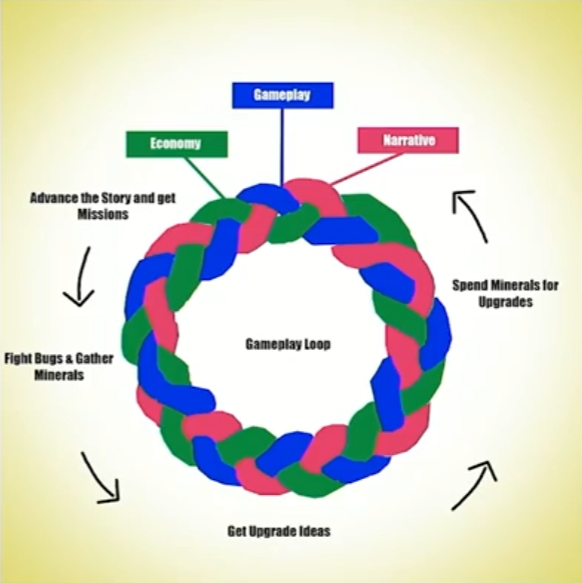 在游戏玩法中加入经济系统能够将短期的玩法转变成长期的玩法,比起仅仅与虫子战斗,通过与虫子战斗获得资源来升级机甲从而更好地提升战斗能力,并推动故事发展是更为丰满而有趣的。如下图所示,经济、叙事、玩法这三个元素同步创建了一个完整的游戏循环,让玩家在整个体验中保持积极性,参与到故事和游戏中。