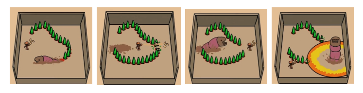 为了贴合“树冠天蓬”主题世界、并有效利用现有资源,两个boss战元素各取所长,boss仍是在地下潜行,但形态听取了他人建议改成长条蜈蚣,行动留下的足迹变成带刺藤蔓,玩家整场战斗也只用回旋镖进行攻击。