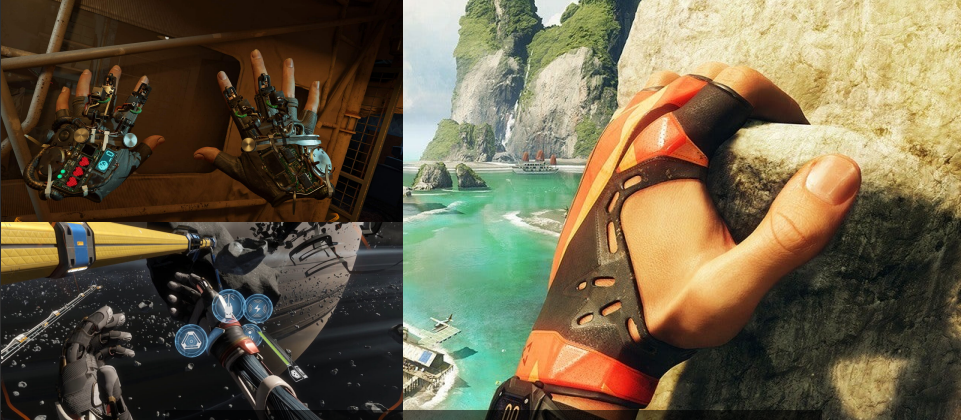 关于手势的设计原则,演讲者提出设计师需要将现实中手部的形状和动作映射到虚拟世界中,与此同时按钮或者指示条就会附着在虚拟世界的手上,就像《半衰期:爱莉克斯》中那样;抑或是简单明了的用户界面会悬停在手部周围,时刻跟随手部的运动,而不是像传统的界面那样悬浮在面前,就像《Lone Echo》中的设计;甚至是双手动作直接与游戏玩法本身相结合,就像《TheClimb2》中的玩法机制。