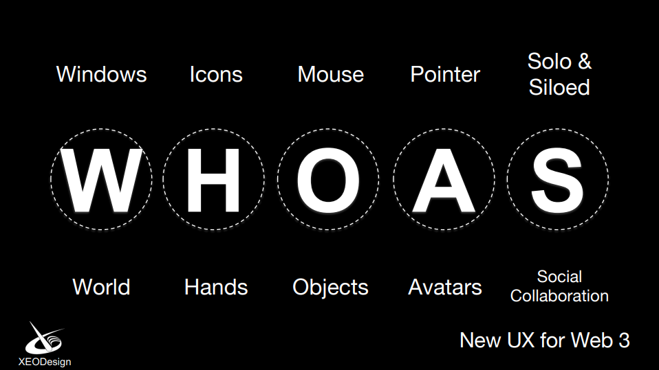 介绍了元宇宙相关的背景知识之后,演讲者提出了面向全息世界的“WHOAS”用户体验模型。