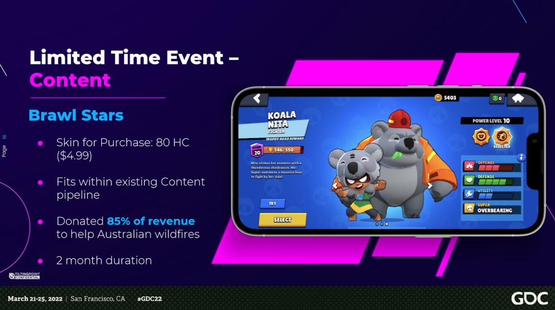 在玩法时间设计方面,开发者们有两个选项:永久性功能和限时活动。限时活动很好理解,开发者可以使用游戏内已有的设计框架来设计一个成本较低的,且不会长时间影响游戏主要玩法体验的活动。比如2020年,Supercell在《荒野乱斗》中推出了一款考拉Nita的皮肤,旨在帮助澳大利亚从山火侵袭的灾难中走出来。两个月的皮肤限时售卖活动结束后,Supercell会将这个皮肤利润额的85%捐给澳大利亚政府,以帮助澳大利亚的野生动物重建家园。制作这样的皮肤成本是相对较低的,因为《荒野乱斗》游戏本身会经常推出皮肤。在这个案例中,除了投入少量的美术资源外,游戏开发者本身用于社会议题植入的成本和风险都是比较低的。