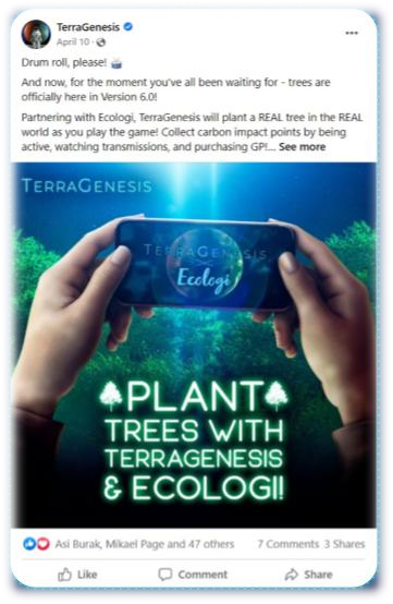而在《飞跃星球》中,玩家可以将贫瘠的星球改造成适合人类生活的家园,这一玩法本身就与植树造林的现实议题非常吻合,那么与现实生活中的再森林化(reforestation)工程合作,也是非常适配的。