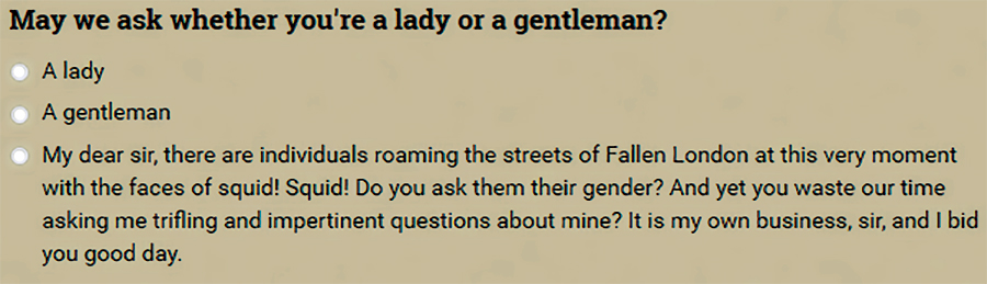Fallen London是一款由 Failbetter Games 开发并于 2009 年发布的游戏。它已在角色创建过程中为玩家提供第三个(无性别)选项