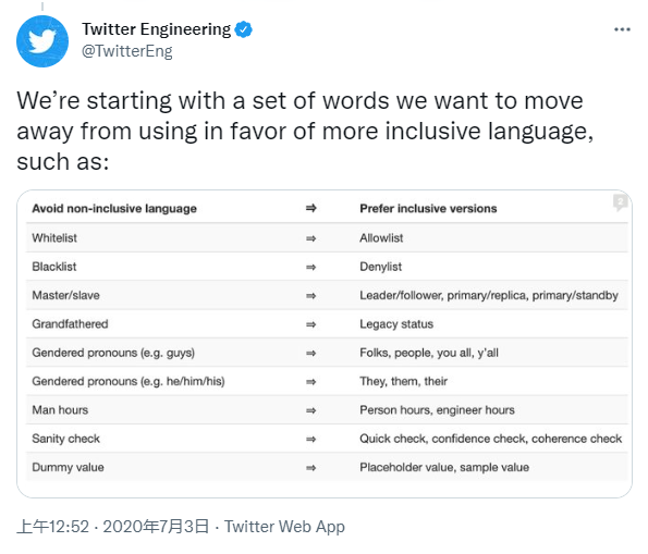 Twitter官方发布了一部分“问题词汇”和推荐的替换词