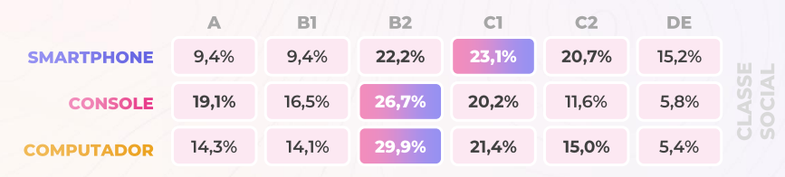 各社会阶层玩家在手机、主机和PC平台玩游戏的比例