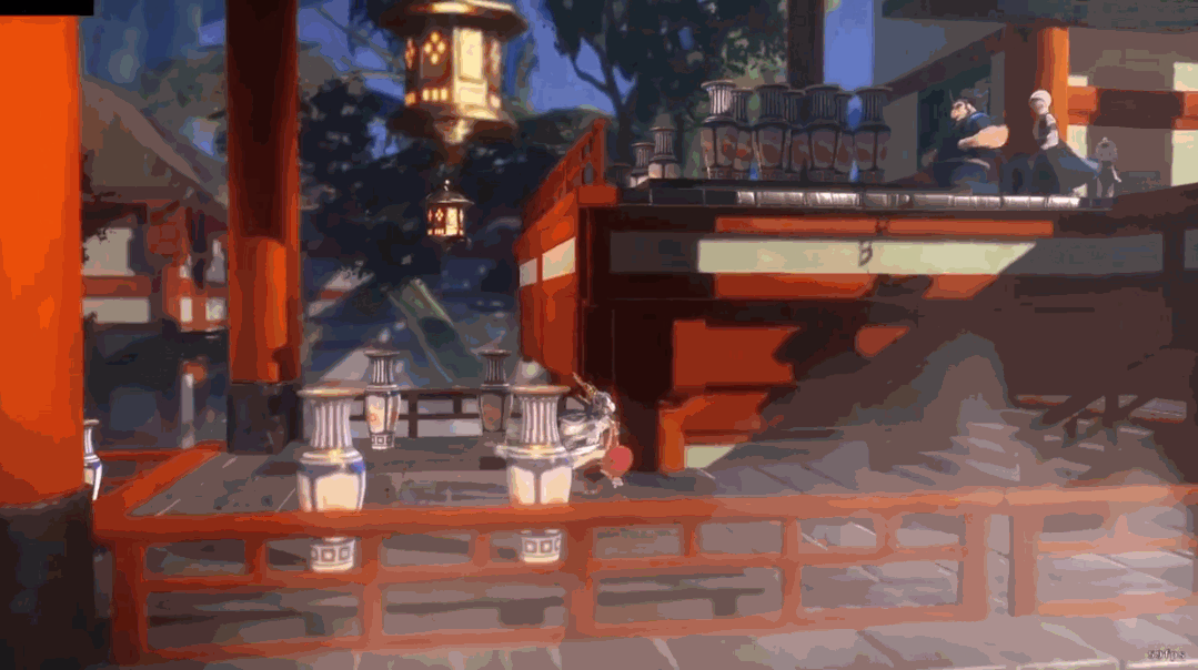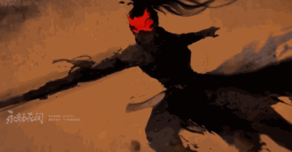 这种转场方式在《永劫无间》中也有运用。比如下面这张动图,人物先出现,然后出现巨爪,最后出现佛祖。虽然是水墨晕染的方式但前后顺序分明,仿佛为我们讲了一个简短的故事,如果仅仅是一张静态的完整图片,那玩家可能没有那么容易注意到巨爪中的人,故事性也没有那么强。
