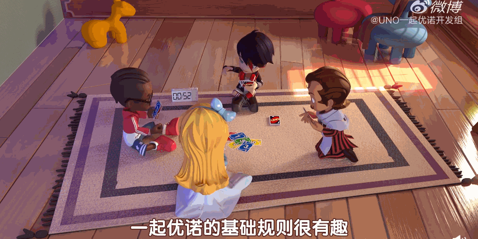 《一起优诺》的新手教学动画也有类似的镜头运用。远景表现人物关系——这是一个4人卡牌游戏;之后镜头拉近特写画面中央的卡牌,以便后续讲解规则。