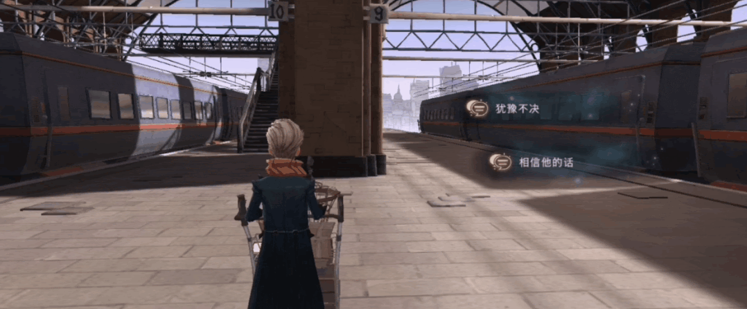 相比电影来说,游戏更加能够增加玩家沉浸感的一点是,动画过程中穿插了一些需要玩家简单交互的环节。比如收到录取通知书时的决策选项、进入对角巷前用雨伞敲击墙面、双指长按手机屏幕冲进月台等等。这些简单的交互,能够给持续的动画片段带来一些变化,给玩家带来惊喜感(尤其是IP粉丝),同时也能更让玩家觉得“是我本人在游戏中行动”。