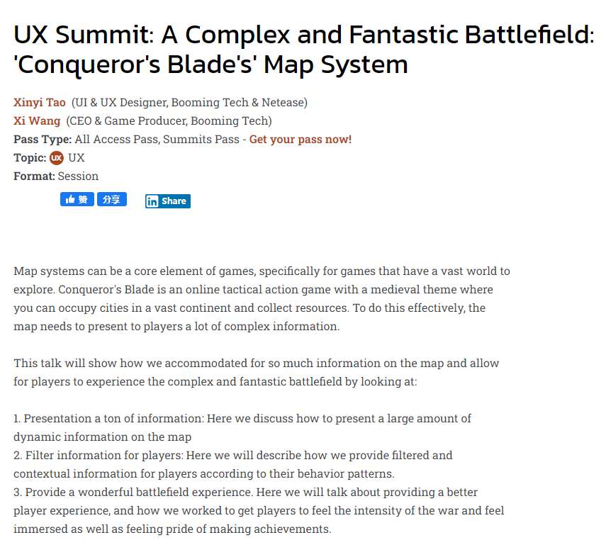 2022年1月5日,GDC开发者大会2022公布了入围演讲,其中雷火UX的用户界面/用户体验设计师桃桃(陶欣怡)的演讲——复杂而精彩的战场:《战意》的地图系统(UX Summit: A Complex and Fantastic Battlefield: 'Conqueror's Blade's' Map System)成功入围!这也是继GDC2021,雷火UX与不鸣科技(杭州)有限公司共同合作的2篇演讲且分别入围核心演讲(设计)与峰会演讲(游戏叙事峰会)后的再度入围!