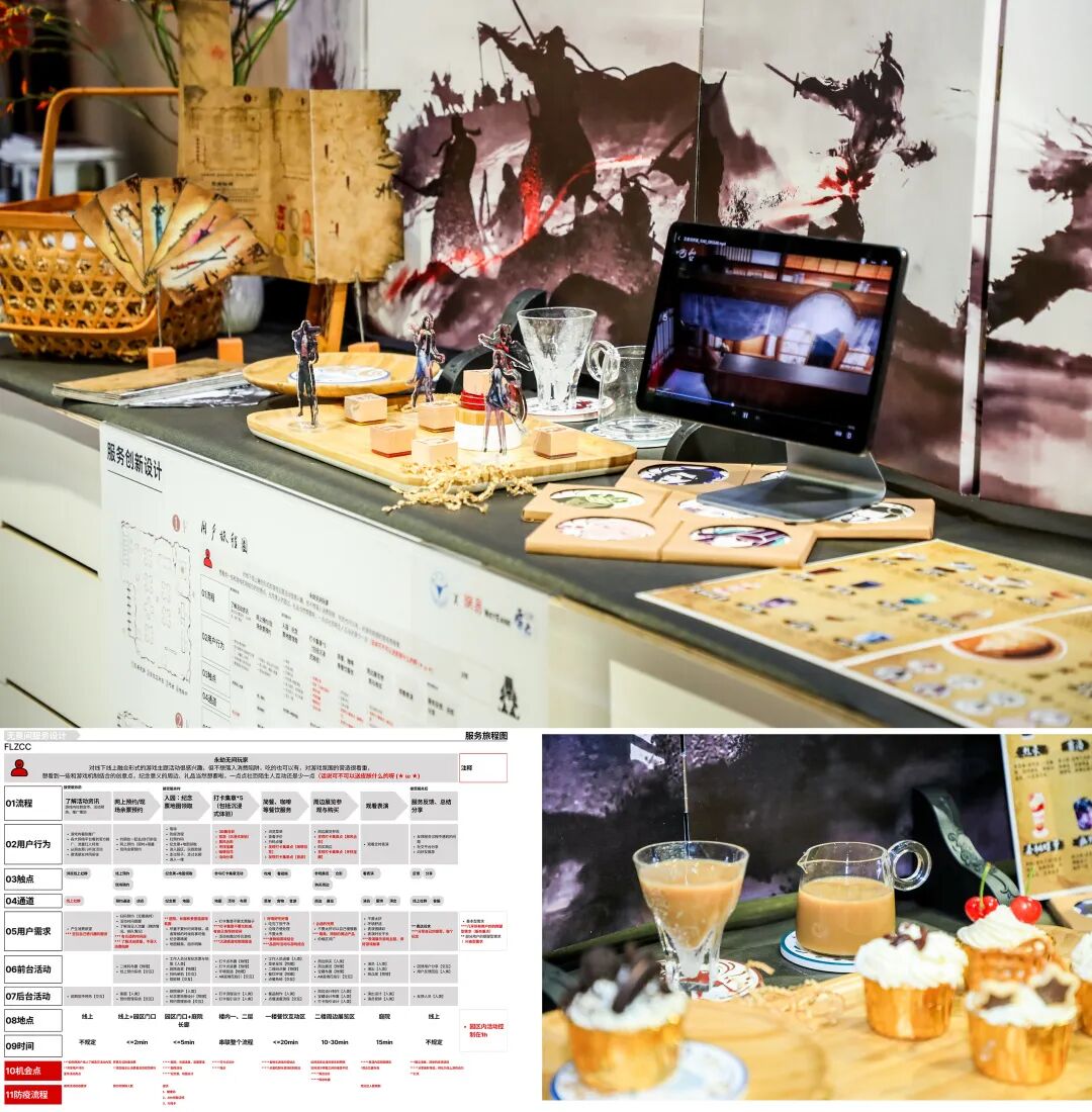 永劫无间知味观联动餐厅是以知味观为主体,结合永劫无间游戏特色设计的一家线下餐厅。我们在一些具有代表性的元素例如:大逃杀模式、古风、格斗等上设置交互通道来营造触点,同时综合运用服务创新设计的思维与方法对知味观线下餐厅的服务流程进行改进创新。本联动餐厅不仅可以借助永劫无间IP促进知味观的线下营销,同时又可以成为游戏玩家虚拟世界和现实世界的交互节点或独属于游戏玩家的“第三空间”。