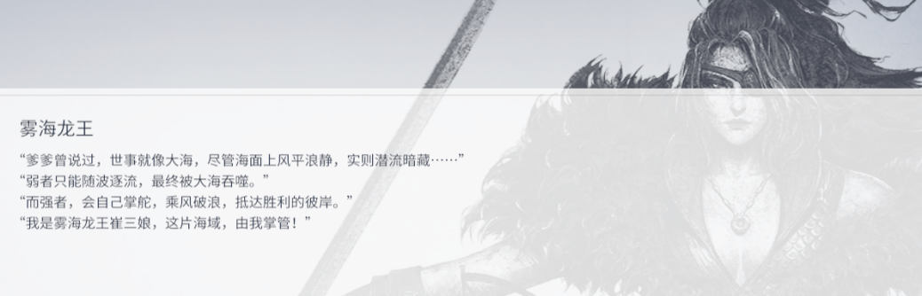 如果采用主客二分法去分析,她们毫无疑问是游戏的中心主体。不仅如此,在英雄传说的相关描述中,我们可以看到她们的成长线和成为强者的决心。例如在崔三娘的英雄故事序章,她的原话“弱者只能随波逐流,最终被大海吞噬。”“而强者,会自己掌舵,乘风破浪,抵达胜利的彼岸。” 永劫无间中很多细节,大到英雄故事,小到一则外观的描述,都不难看出女性角色被给予了更多的主导地位,以及她们自身抗争意识的觉醒。