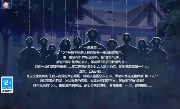 日式独立文字解谜游戏中最常见的推理背景设置是“暴风雪山庄模式(孤岛模式)”,它的概念首次出现于阿加莎·克里斯蒂的小说《无人生还》之中,由于《无人生还》的故事舞台是一片孤岛,因此“暴风雪山庄模式”也被誉为”孤岛模式。这种推理背景的设定在日本得到了再创作并走向了辉煌,现在很多日本独立AVG游戏中,“暴风雪山庄”的设定都会有所体现。“暴风雪山庄”是一种因为自然或人为因素而导致所有出场人物聚集在一个相对封闭的环境内,且暂时无法与外界取得联络的孤岛困境。在所有人无法离开的环境下,出现不断有人被杀害的离奇事件,而凶手就隐藏在这些人当中。在文字解谜游戏中,玩家往往需要扮演侦察者,在幸存者越来越少的情况下进行线索搜查与推理。