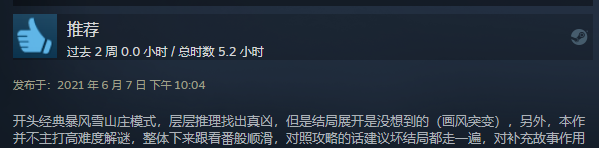 暴风雪山庄模式因为对于游戏氛围有很好的渲染作用,在这几年也被越来越多的运用于国内的同类型游戏中。国产独立游戏《迷雾之夏》也用了同样的手法,将谋杀案的发生设定到了山顶别墅,主人公需要与外界失去联系的山顶孤岛别墅内度过7天,并找到故事的真相。与故事中的角色们站在同一起跑线,在封闭的环境中进行解谜,在阅读中互动,暴风雨山庄游戏往往伴随着设计精巧的“逻辑性”与动人心弦的“剧情性”。因此这一类的游戏成为了推理爱好者的天堂。