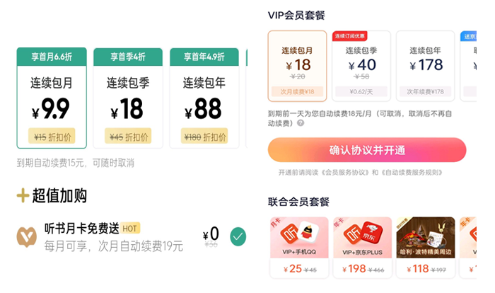 APP中的会员定价:既进行了内部对比-包月/包季/包年,也将单个会员和组合会员做对比以促进购买