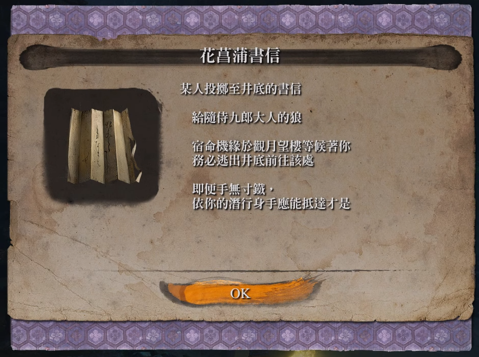 玩家饰演的狼在游戏开场获得一封无名人投递的信,这封信的描述不止有信的内容,还有一句“某人投掷至井底的书信”,不仅想要将书信的内容告知玩家,更是想让玩家明白这件道具从哪来,道具相关的信息是什么、与谁有关、为什么。从而让玩家慢慢习惯这种信息融入到道具之中的叙事手法,逐渐勾起他们的好奇心。