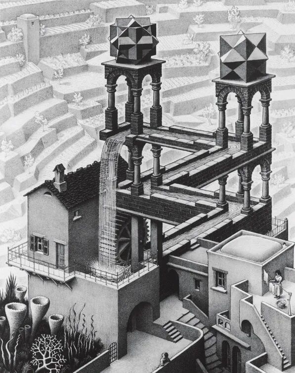 著名版画大师埃舍尔的名画《瀑布》,描绘了一个可以依靠“循环流淌的瀑布”来使流水轮永远运动的建筑。观者一眼看上去会感觉画中的瀑布在流动,但仔细观察会发现,图中的瀑布会源源不断地流下,落下的水却逆流而上,这是一种在二维空间中可以合理地描绘出来,实则不可能出现在三维空间的视错觉画面。