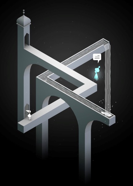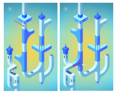在《纪念碑谷》IDA'S Dream 艾滋病慈善特别篇的第三关中,就采用了完形的视错觉艺术,这是在现实世界中不可能存在的城堡,每个浅灰色的走廊都可以通过旋转深蓝色的建筑物来补齐空缺。玩家可以凭借先前的视觉经验,自动连接走廊,在游戏中,光影一旦统一,就意味着出现了新的路径。