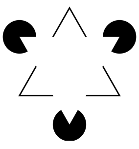 当人们的视觉中心聚焦在某一个复杂图形上,人脑会根据存储在记忆中熟悉性的形状或轮廓,去判断眼前的事物,在获取相关提示后,人们的视觉经验会自动补齐图像中不完全的轮廓的其余部分,这就是心理学中所说的完形错觉。例如,在下图中,观者似乎能自动看到一个实际上并不存在的白色三角形。