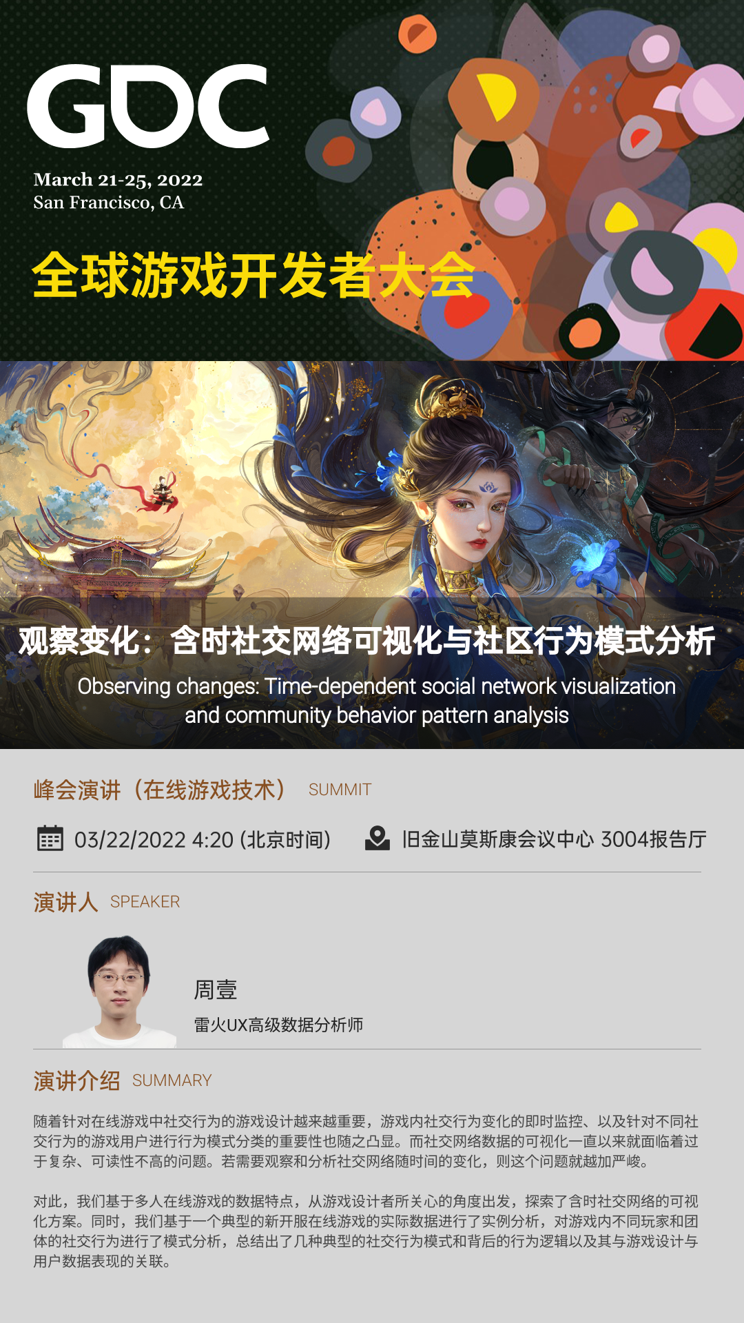 周壹,现任雷火UX高级数据分析师,负责分析游戏数据、研究建模、呈现结果并给出落地性建议。他主要的研究领域包括数据挖掘、机器学习,涉及推荐策略和游戏AI等方向。他专注于在雷火的几款游戏中使用数据分析和推荐算法来改善用户体验,研究如何利用数据与数学来解释现状并给出优化方案。