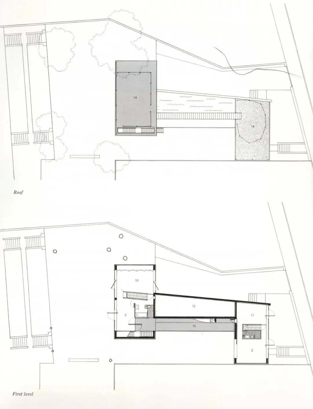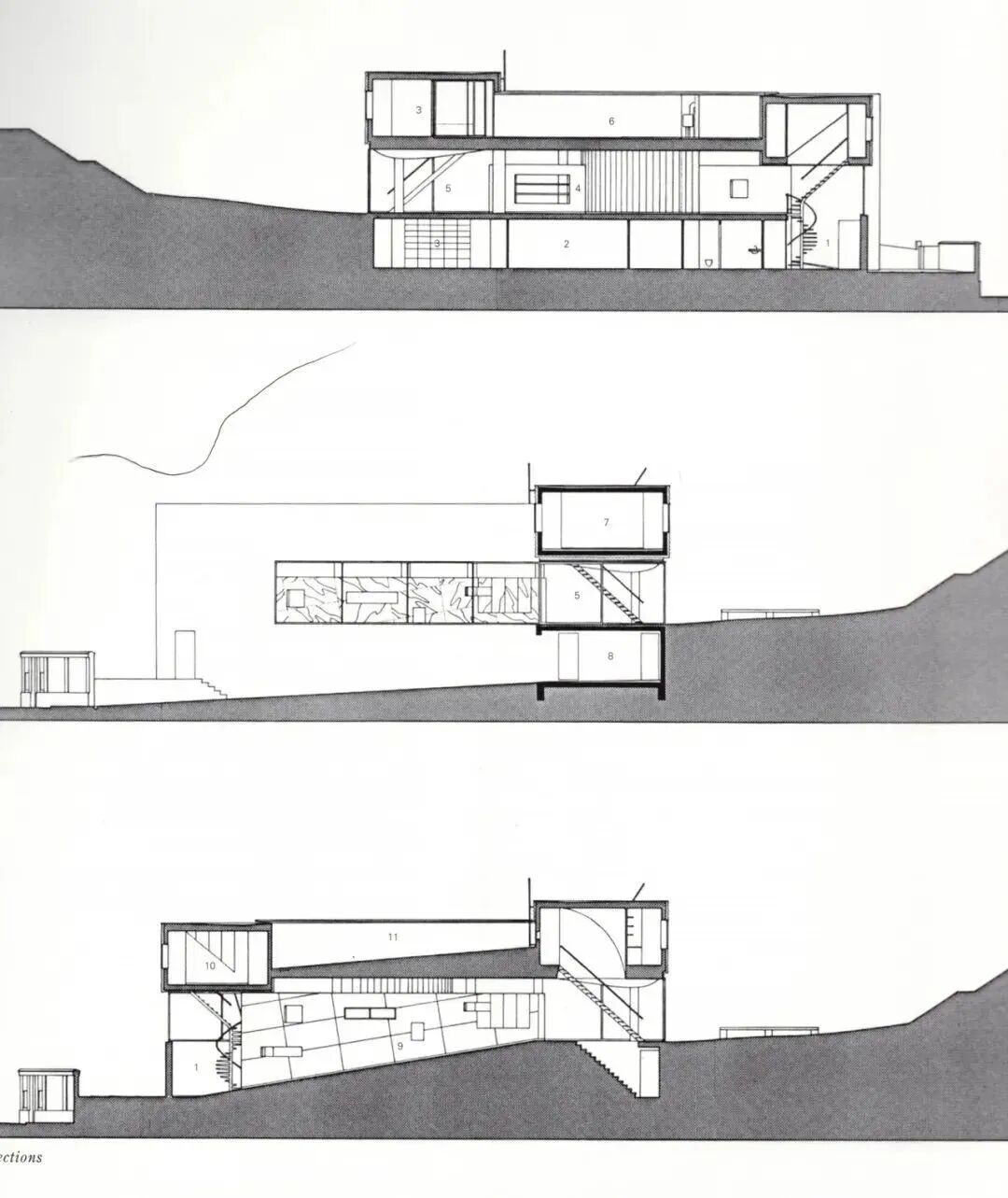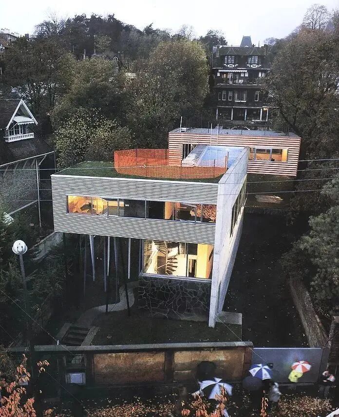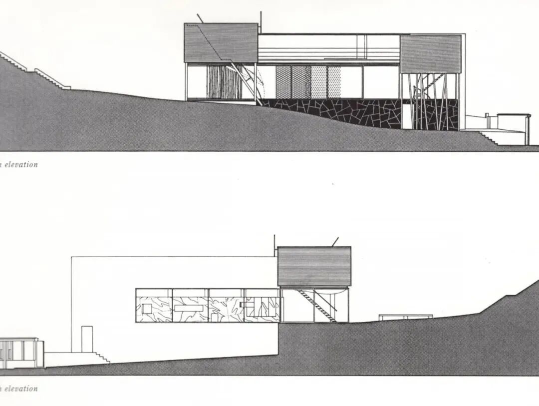 最终建成的别墅由三个部分组成:一个倾斜的花园,别墅的建筑主体,带入口通道的街道层车库。别墅被设想为一个玻璃亭子,包含起居和用餐区,两个架空、垂直的公寓转向相反的方向,以获得相应的视野。它们之间由游泳池连接,游泳池位于混凝土结构之上。