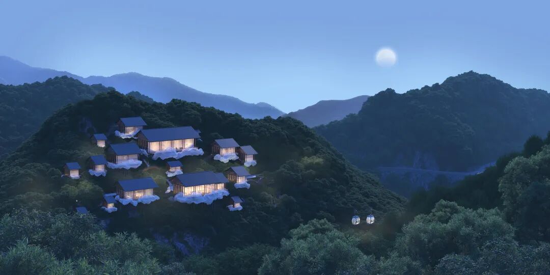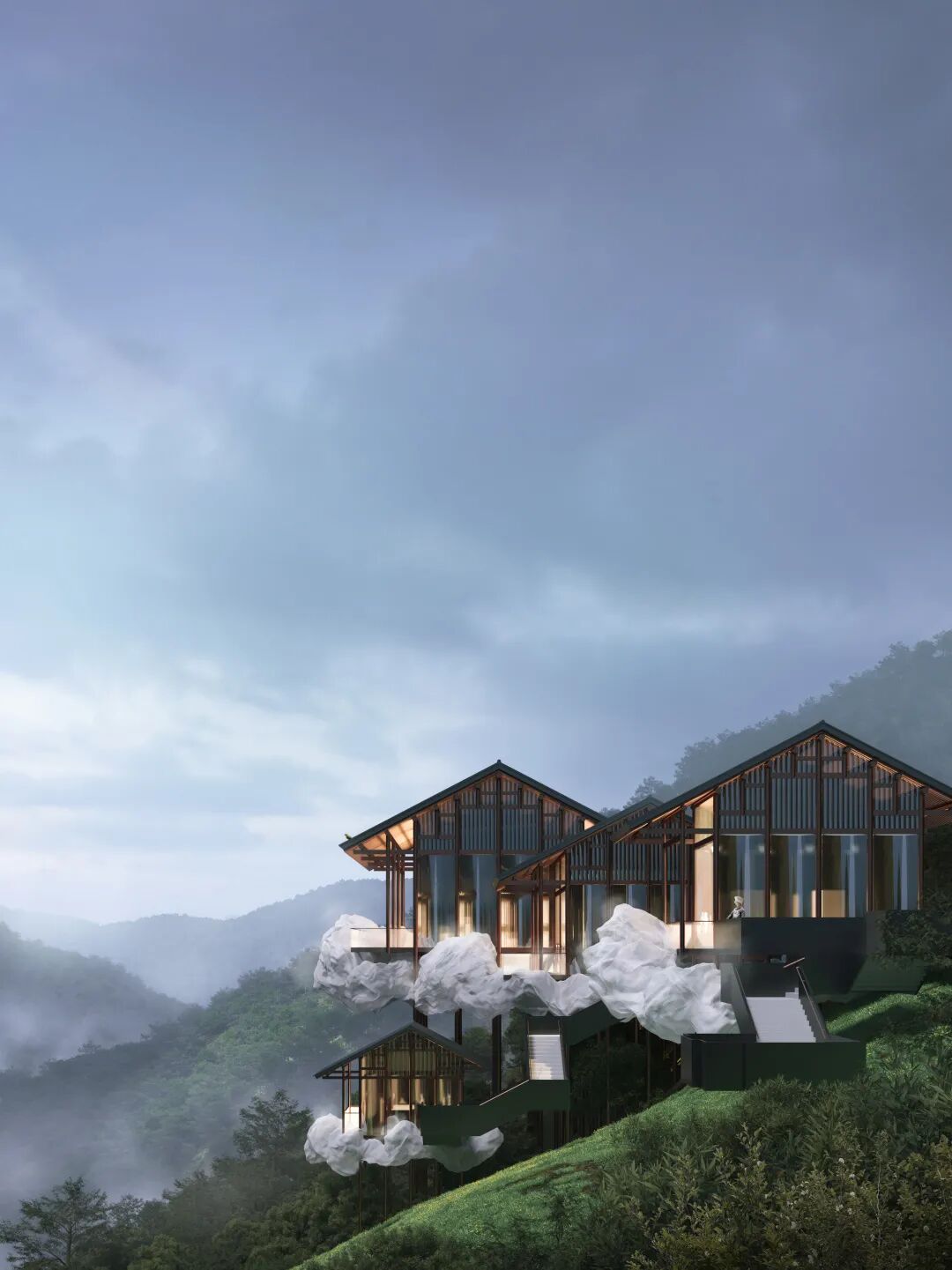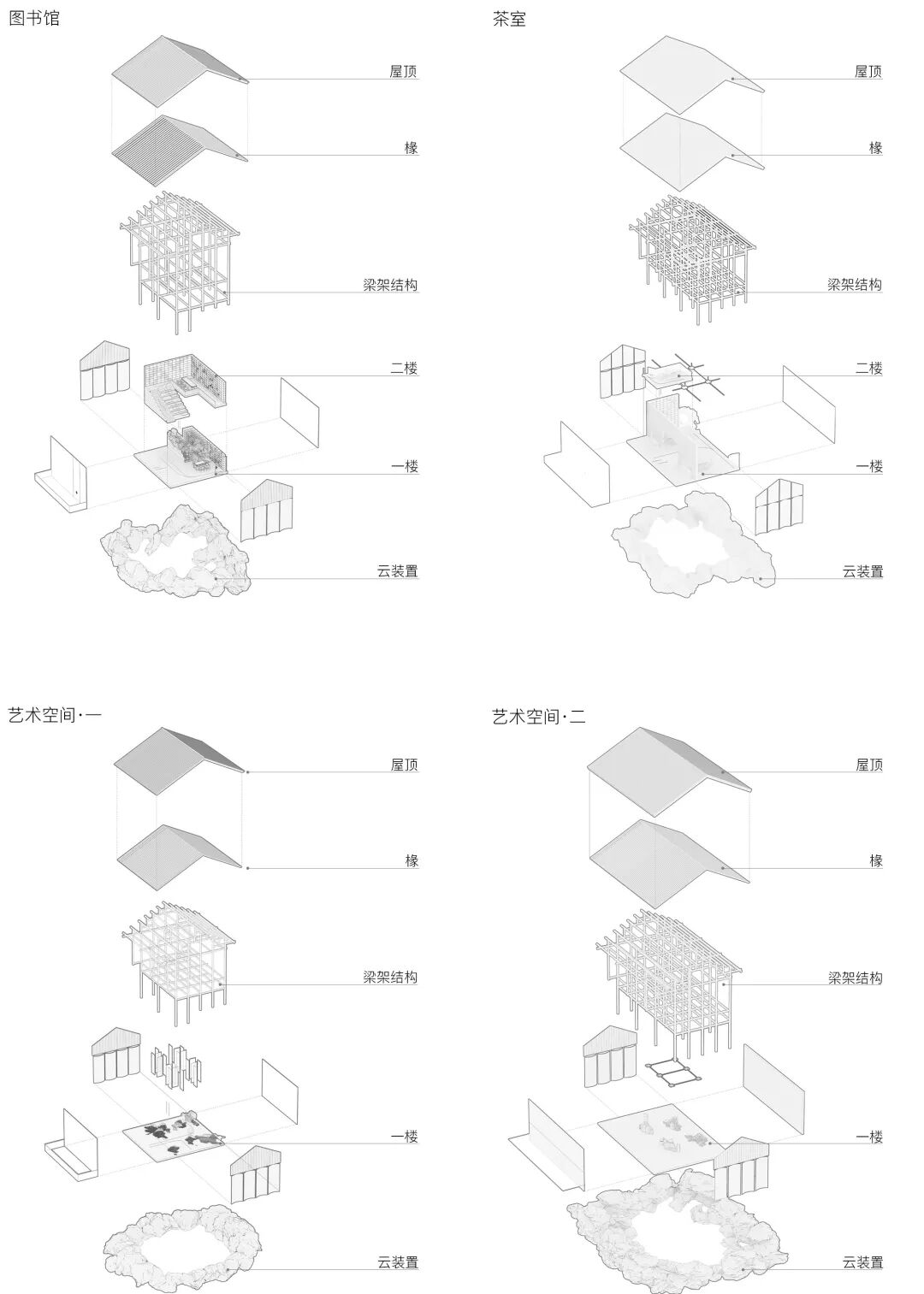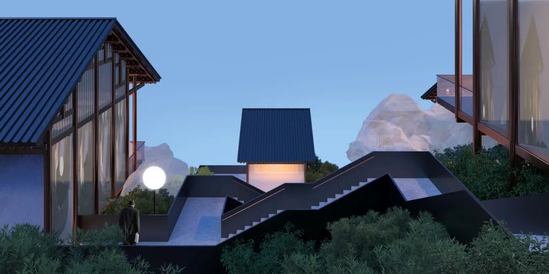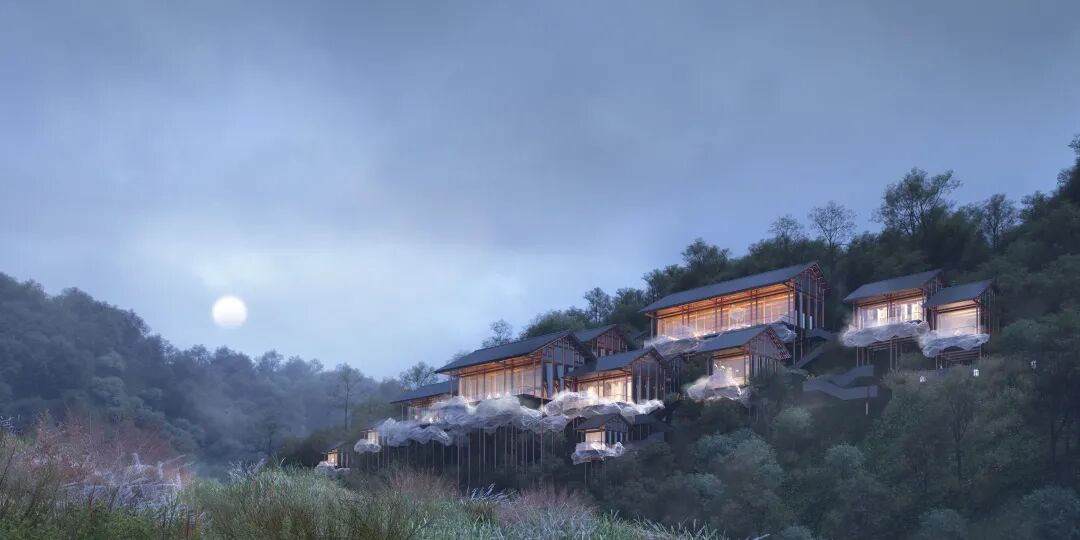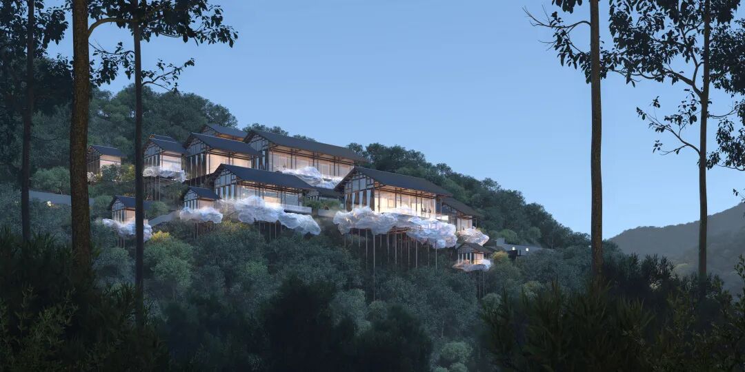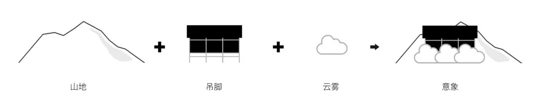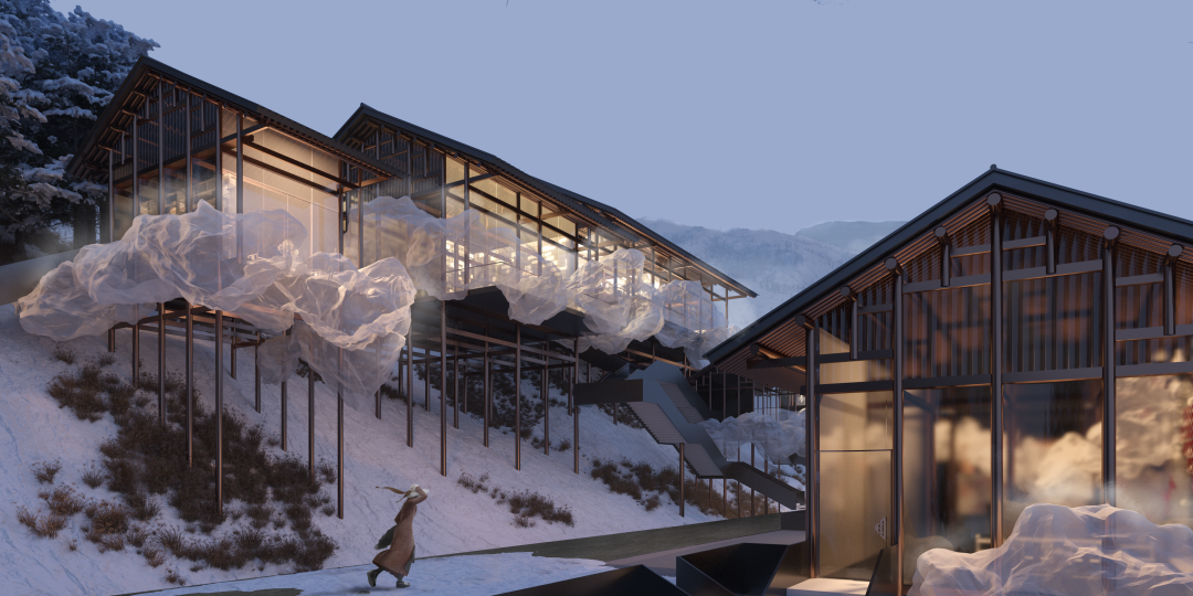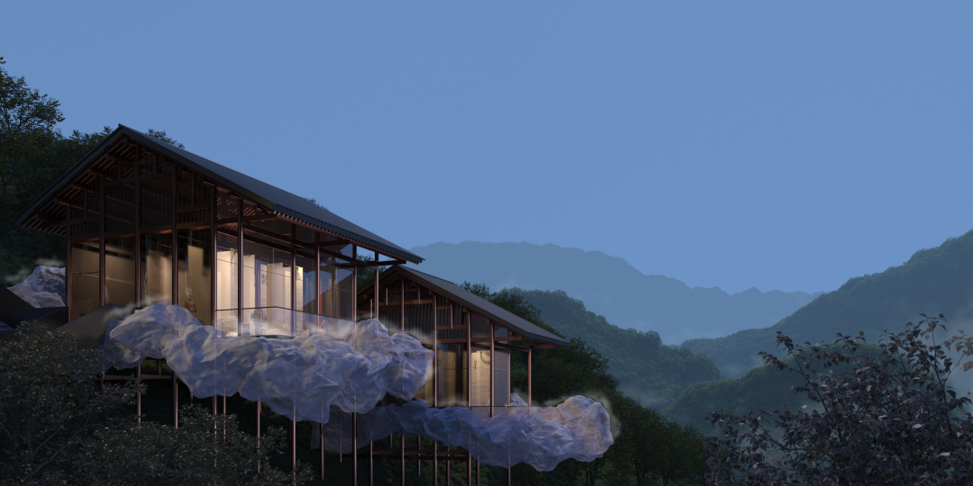 所有房屋都被其包裹起来,并贯穿整个场地。在不同的室内外空间中都有它不同的变换形态。当充满理性与秩序的建筑结构与这个自由的“云雾”结合时,我们希望营造出一种真实的不真实感。兼顾建造的需求与不断追寻诗意的生活态度。