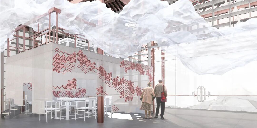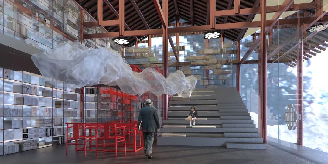 “云”在室内空间中扮演着故事发生的场景,使场所中的一切活动更具诗意——在云中徐行,在云中阅读,在云中邂逅。