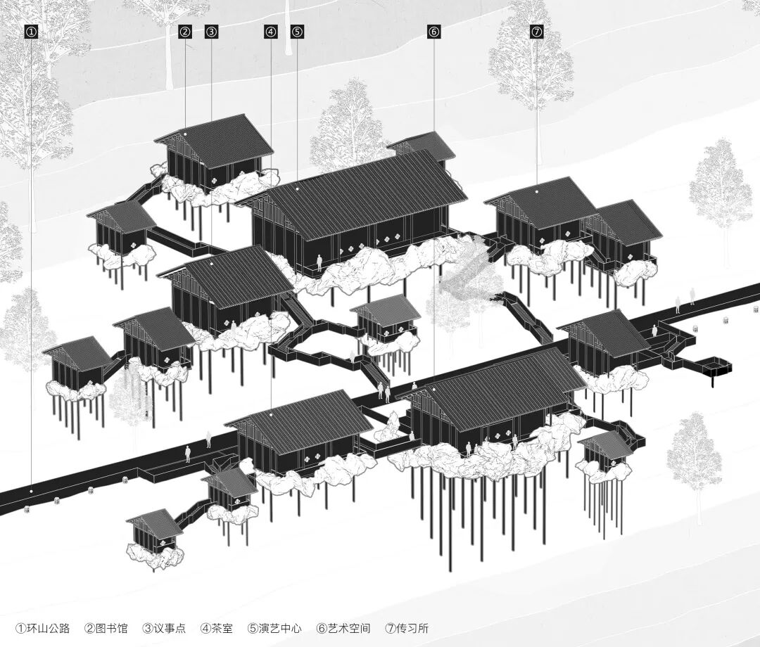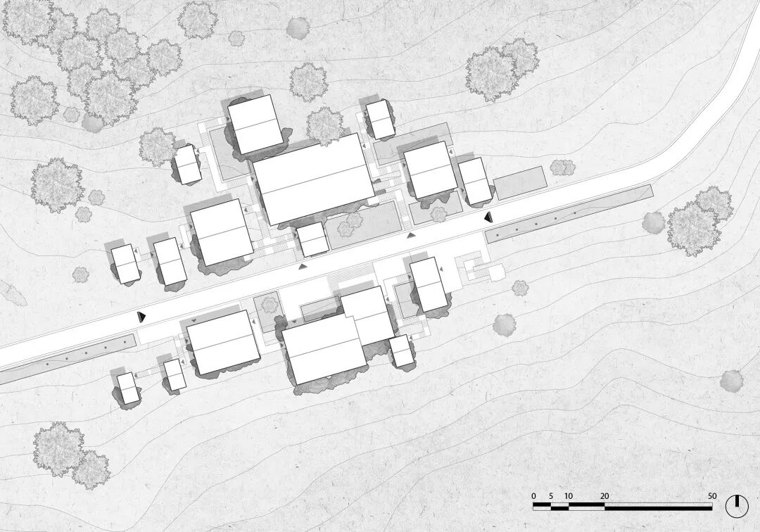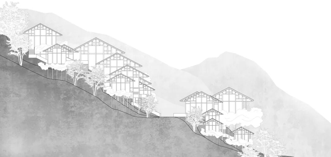 场地位于村寨西边的山坡,面向河谷和群山。树林茂密,并自始至终被一条步道贯穿。当行人沿步道从树林穿过看到村寨时,会有“柳暗花明又一村”的体验,我们希望把这种体验保留下来。同时出于对自然的尊重。在进行方案设计时,尽可能地保持了场地原有状态。