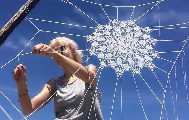 内斯彭创作的作品介于街头艺术、绘画、雕塑之间,除了画在墙上的图案之外,艺术家还会用一种特别的材料,制作蕾丝雕塑,一根根长长的线,编织出一个巨大的蕾丝网,真的好像给街头穿上了一件华丽的蕾丝外套。