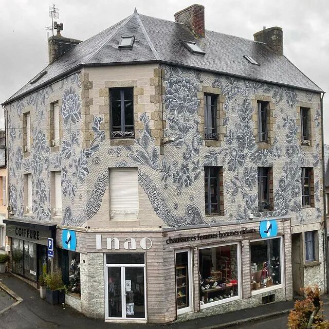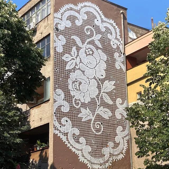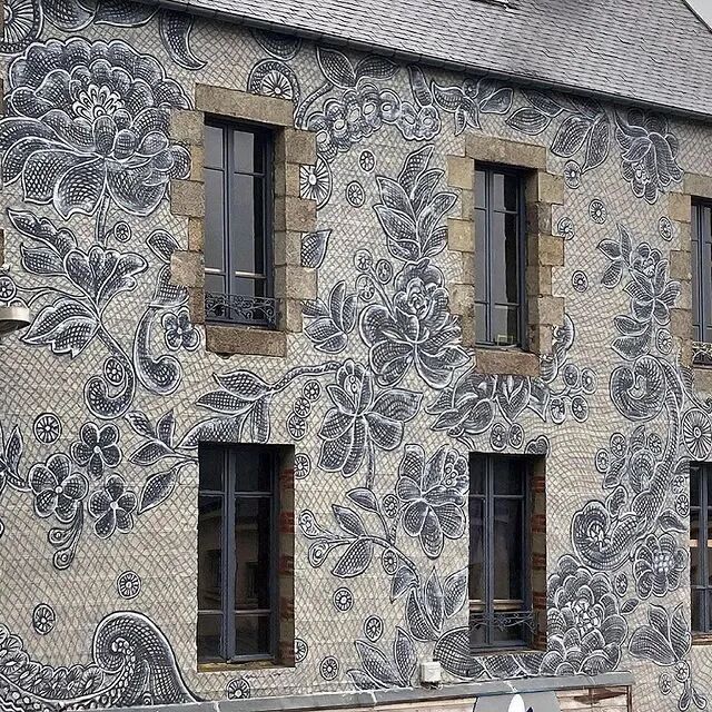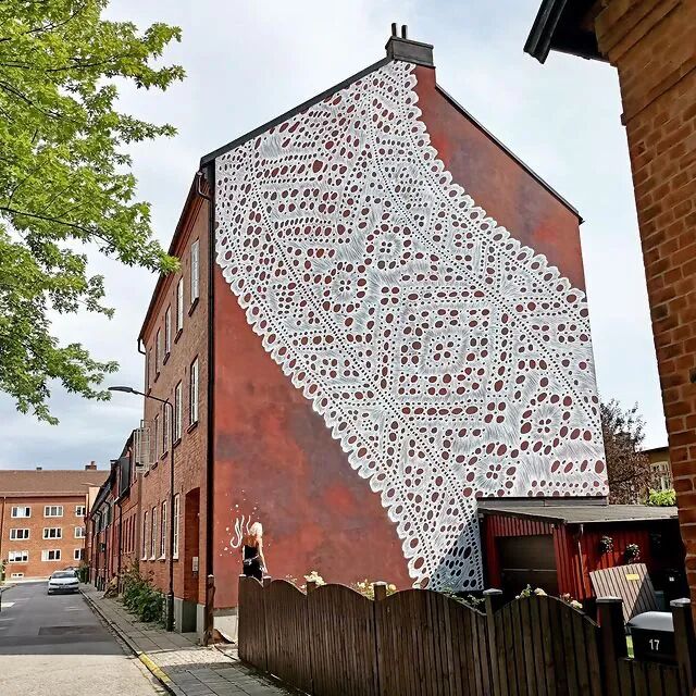 但是内斯彭所运用的材料,却更加复杂,她使用手绘和喷漆相结合,将朴素的墙壁,变成了覆盖着蕾丝图案的画布,大街小巷到处都能看到这样的作品,整个城市仿佛穿上了蕾丝新衣,浪漫、精致极了,充满了诗意。