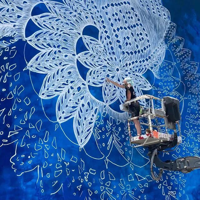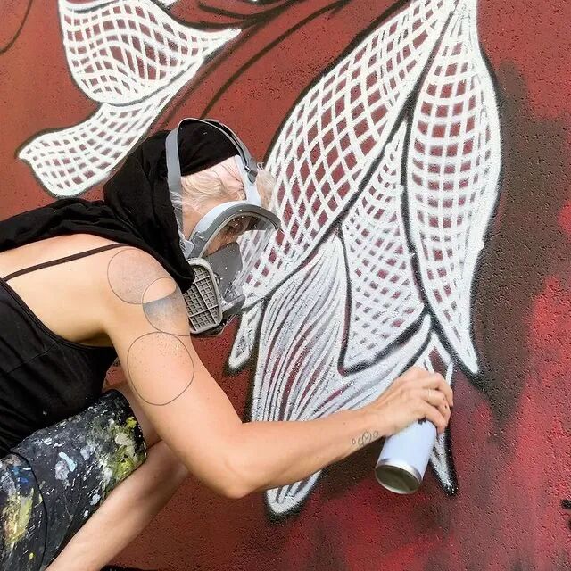 蕾丝是她的本命,从她左肩膀上的蕾丝纹身图案,我们就能看得出来。在一个平平无奇的午餐时间,内斯彭被桌子上铺着的蕾丝桌布所启发,开始尝试将面料上的蕾丝图案,“搬”到城市的公共空间上。对于街头艺术家来说,在城市的街头创作大型的涂鸦,一般采用的都是采用自动喷漆,将丙烯酸调和漆,通过特殊方法处理后,再经过高压灌装到气雾罐中。艺术家用这种气雾罐,喷出精彩的涂鸦作品。