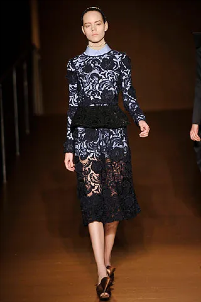 2008年Prada秋冬设计中蕾丝作为主体面料的使用形式抓住了全场的眼球,Miuccia Prada的设计把人们从对于蕾丝的一些固有的使用方法中解放了出来,使得蕾丝所表达的女性气质得到了更完美的展现。