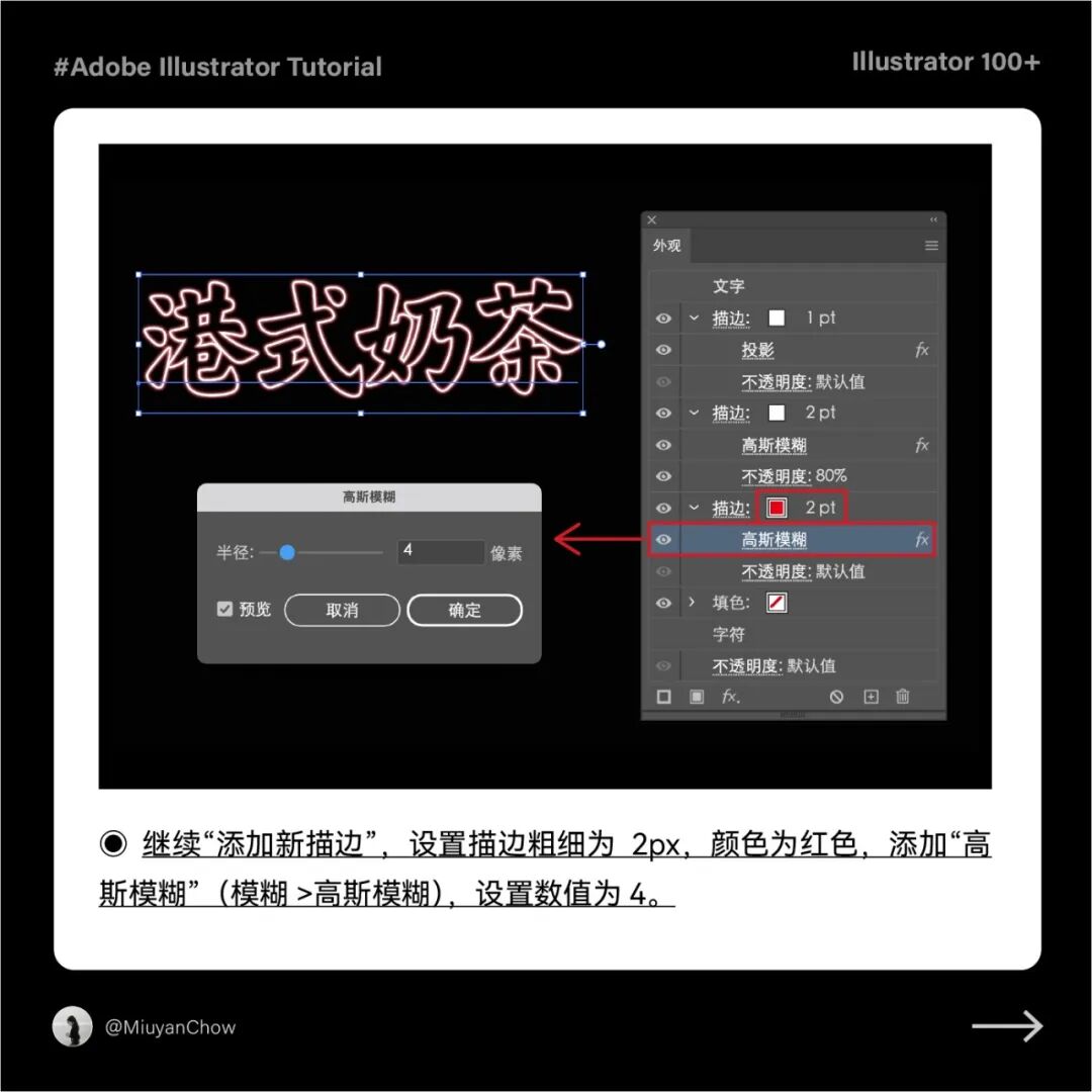 ❹ 继续“添加新描边”,设置描边粗细为2px,颜色为红色,添加“高斯模糊”(模糊>高斯模糊),设置数值为4。