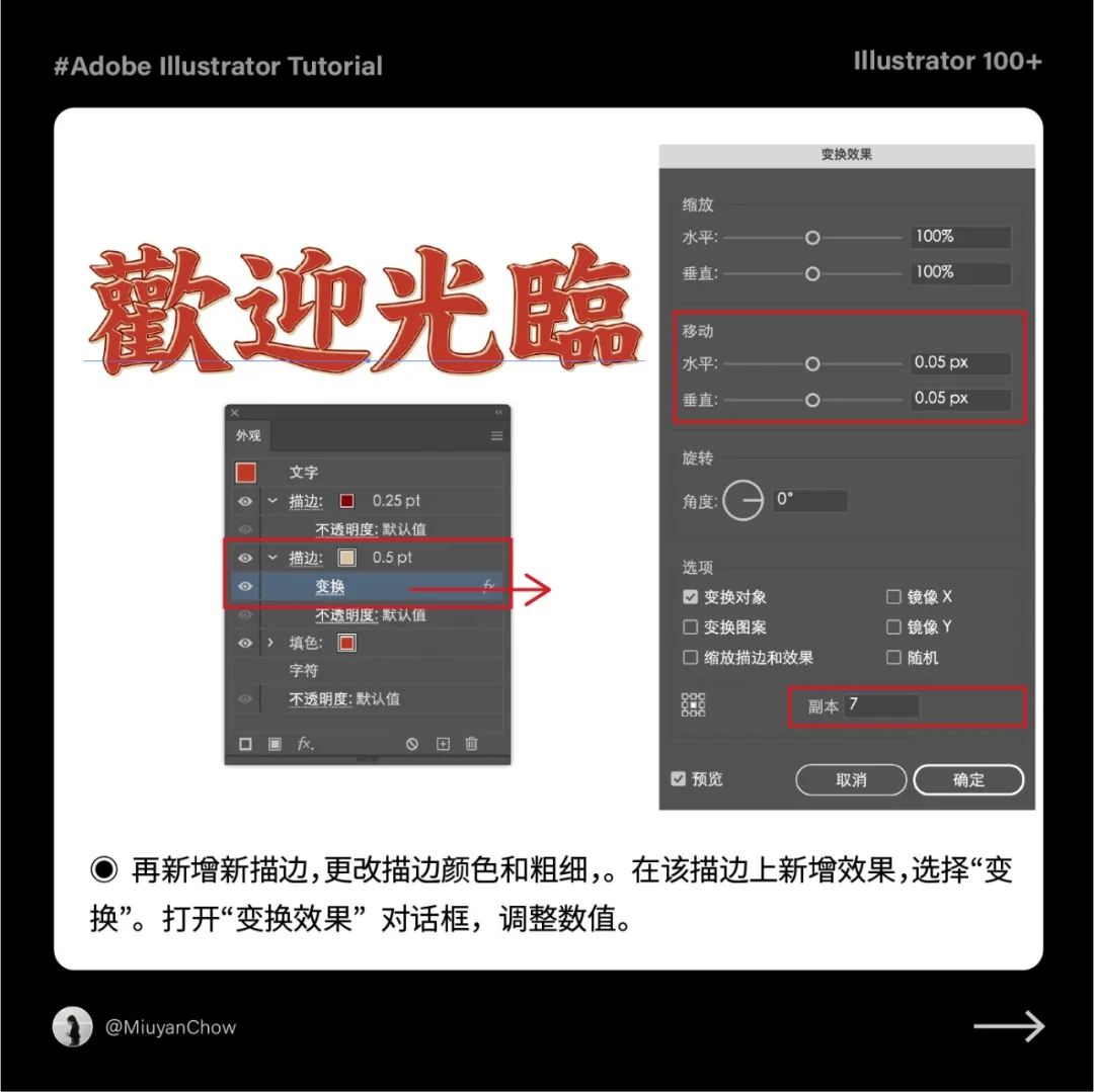 ❸ 再新增新描边,更改描边颜色和粗细。在该描边上新增效果,选择“变换”。打开“变换效果”对话框,调整数值。