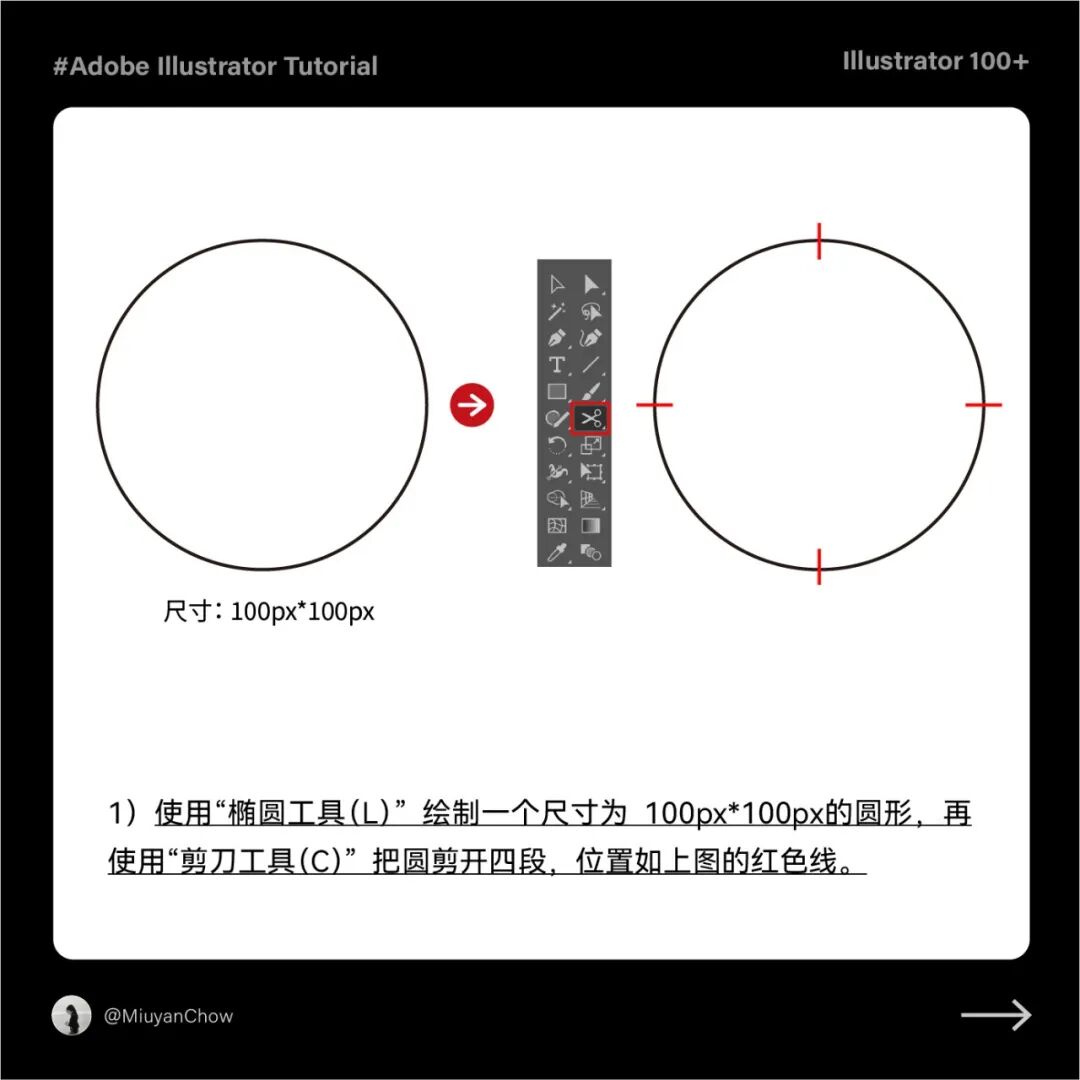 ❶ 使用“椭圆工具(L)”绘制一个尺寸为100px*100px的圆形,再使用“剪刀工具(C)”把圆剪开四段,位置如上图的红色线。