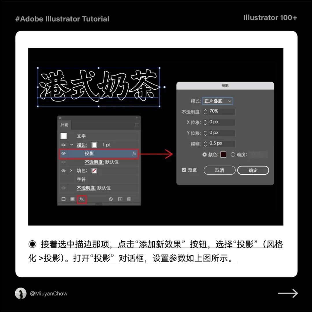 ❷ 接着选中描边那项,点击“添加新效果”按钮,选择“投影”(风格化>投影)。打开“投影”对话框,设置参数如上图所示。