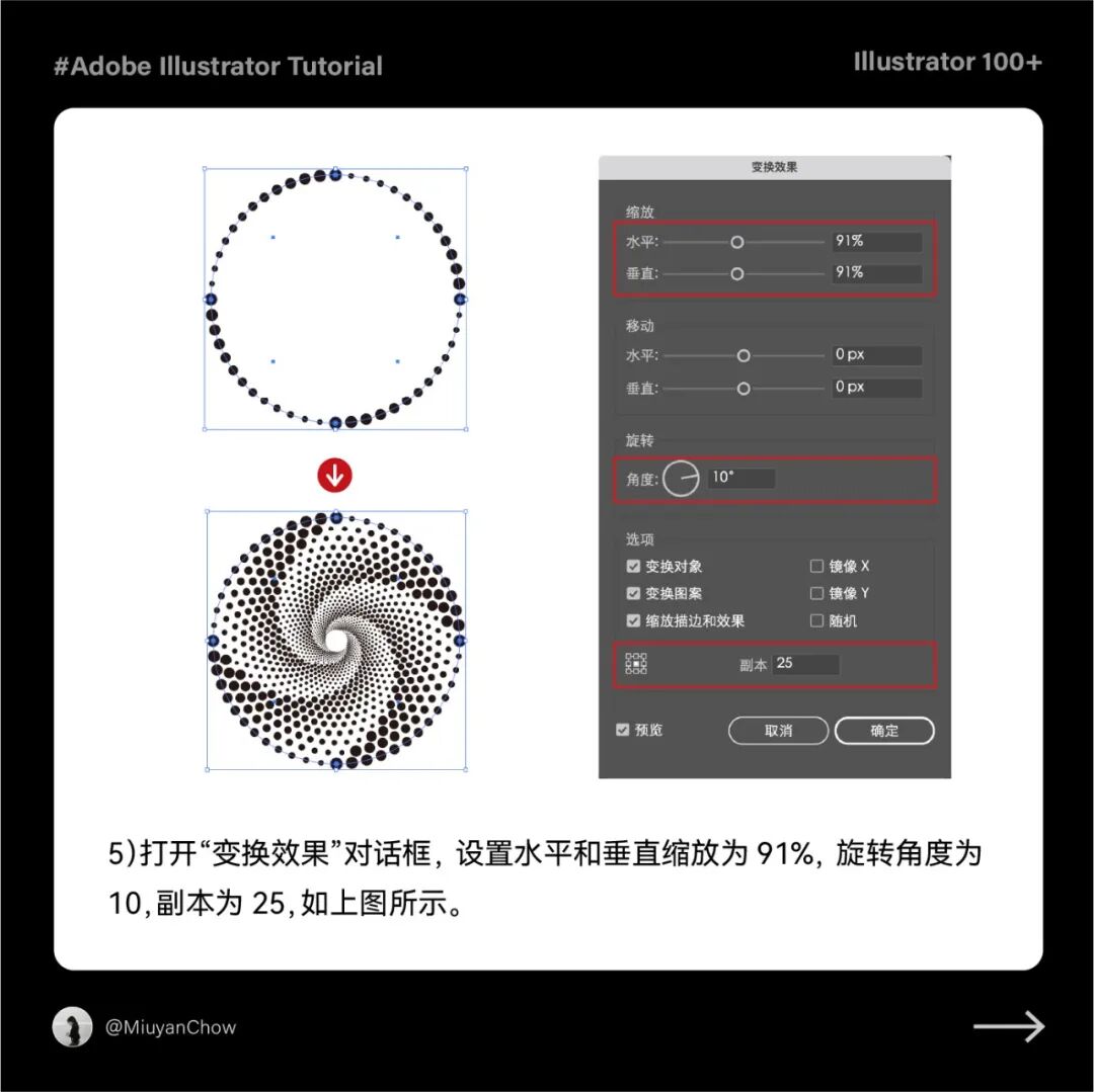 ❺ 打开“变换效果”对话框,设置水平和垂直缩放为91%,旋转角度为10,副本为25,如上图所示。