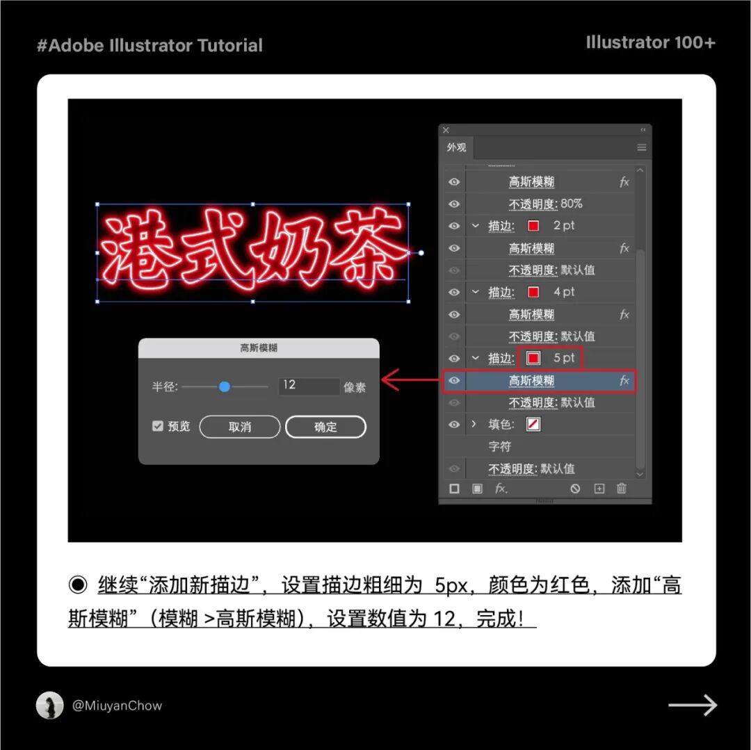 ❻ 继续“添加新描边”,设置描边粗细为5px,颜色为红色,添加“高斯模糊”(模糊>高斯模糊),设置数值为12,完成!