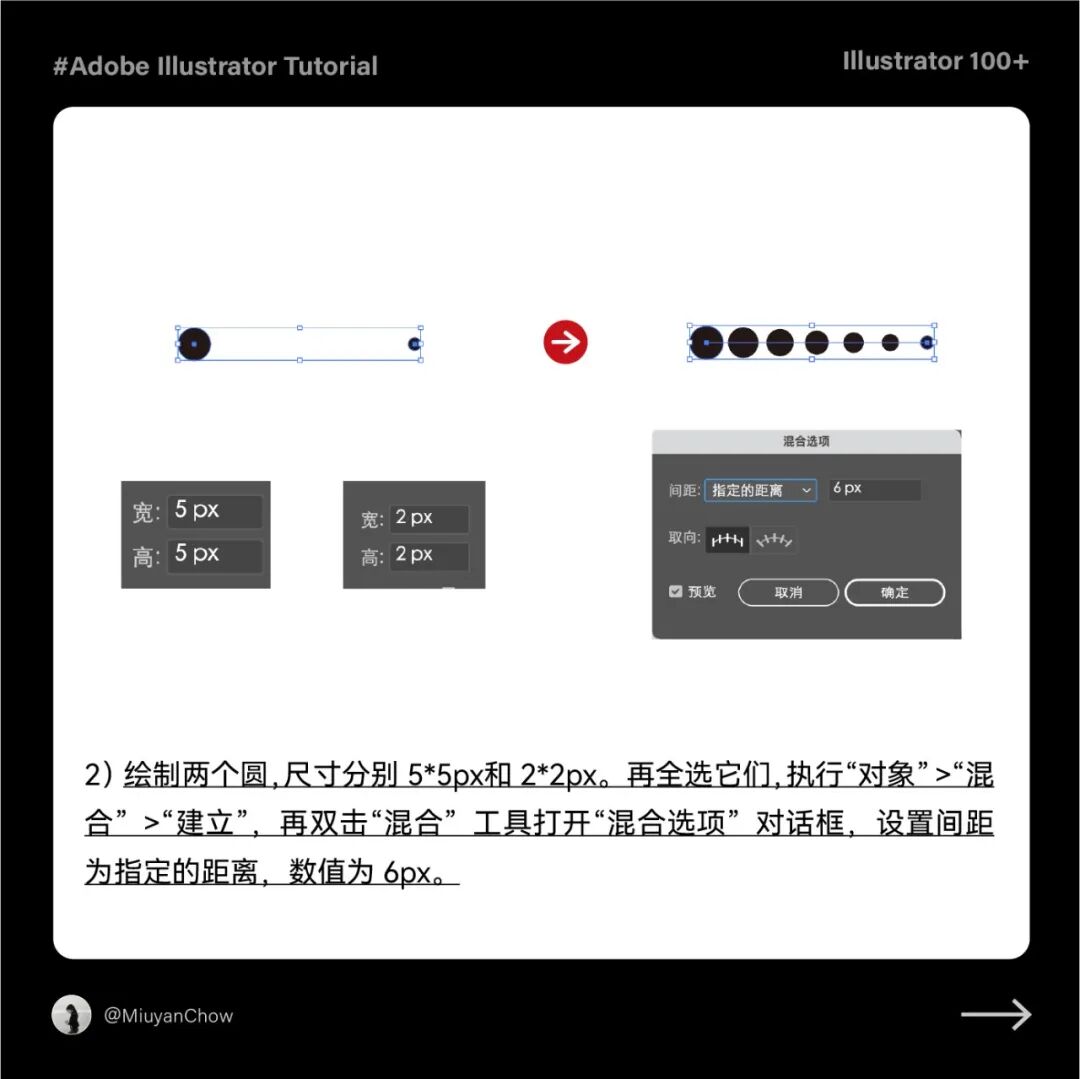 ❷ 绘制两个圆,尺寸分别5*5px和2*2px。再全选它们,执行“对象”>“混合”>“建立”,再双击“混合”工具打开“混合选项”对话框,设置间距为指定的距离,数值为6px。