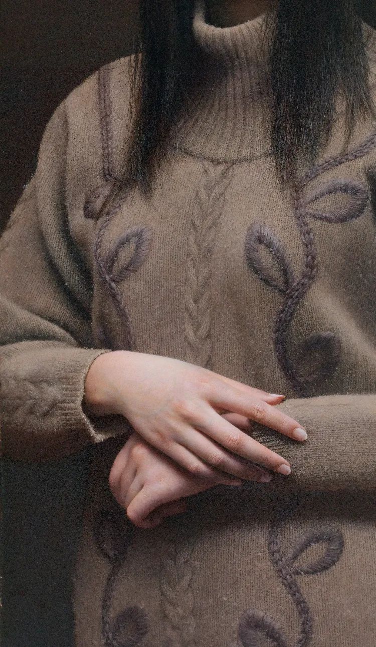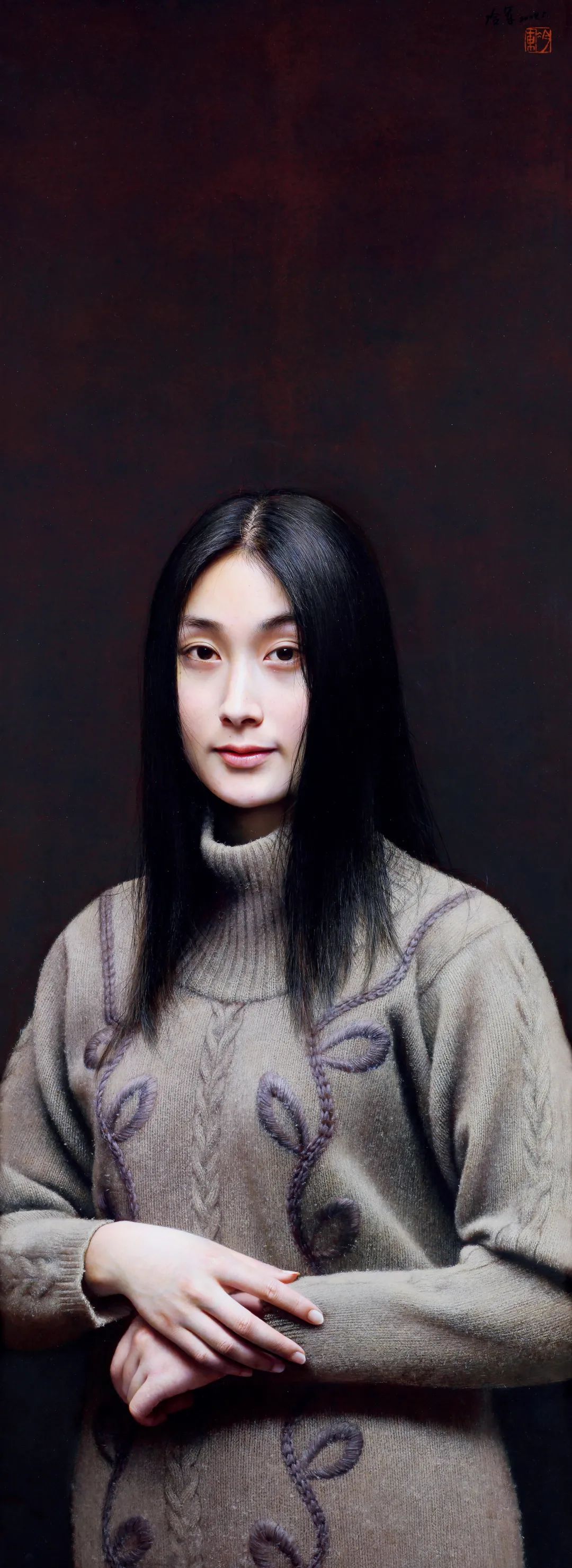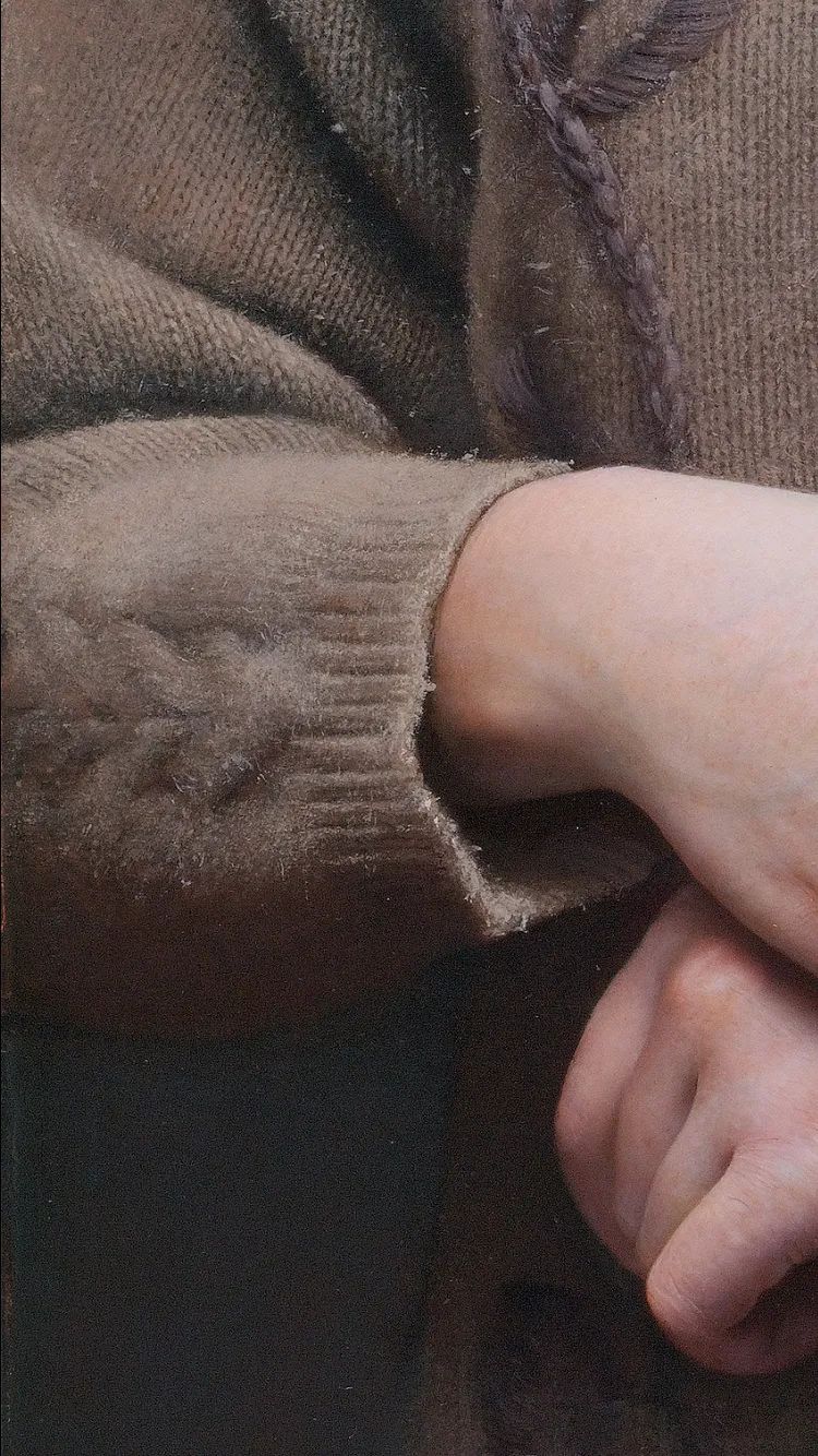 精湛的写实毛衣、抱胸微笑的东方女子,她的每一根发丝、衣服毛线像一个活脱脱的人物站在你眼前。