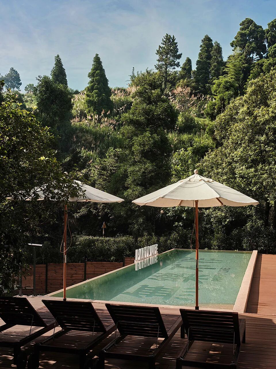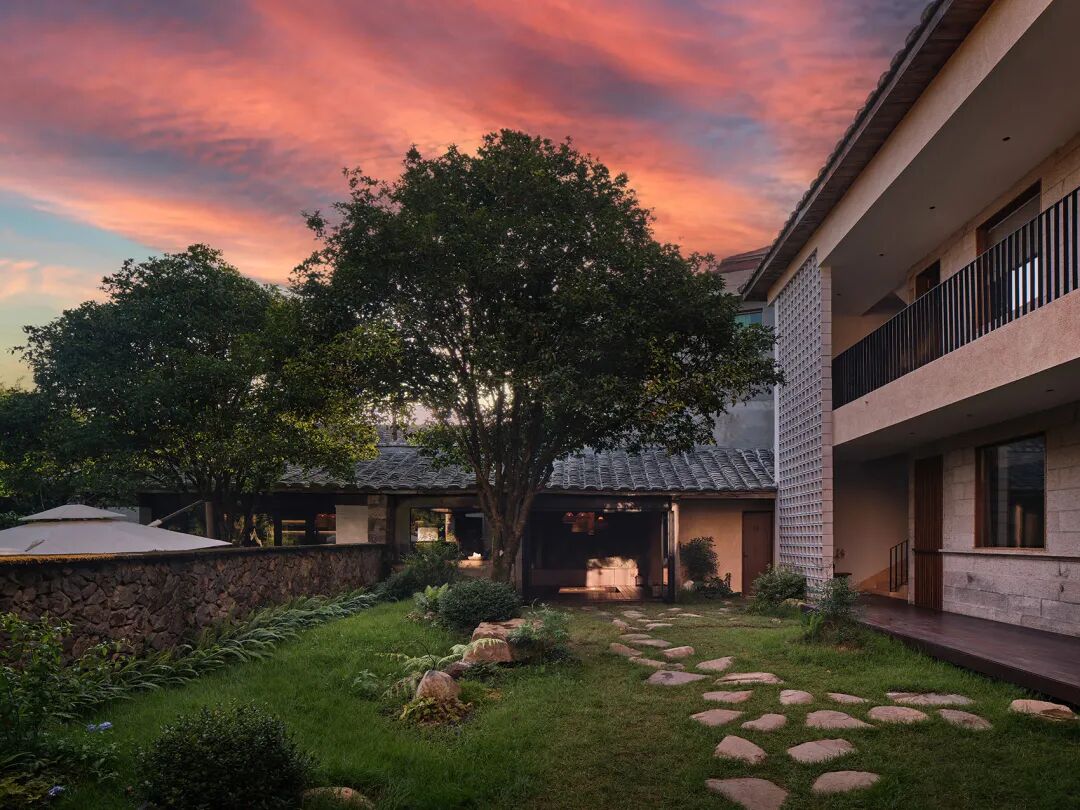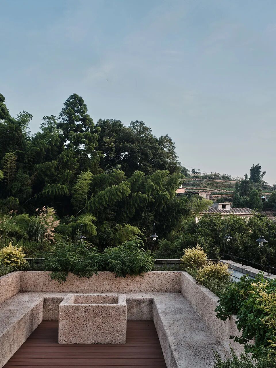 因此走进樂山,人们总会第一时间被外院的巨大游泳池吸引。它就在四周高大葱郁的树木之间,与自然环境遥相呼应,青翠透亮,波光粼粼。即便还未入池畅游,就已令人身心舒展。