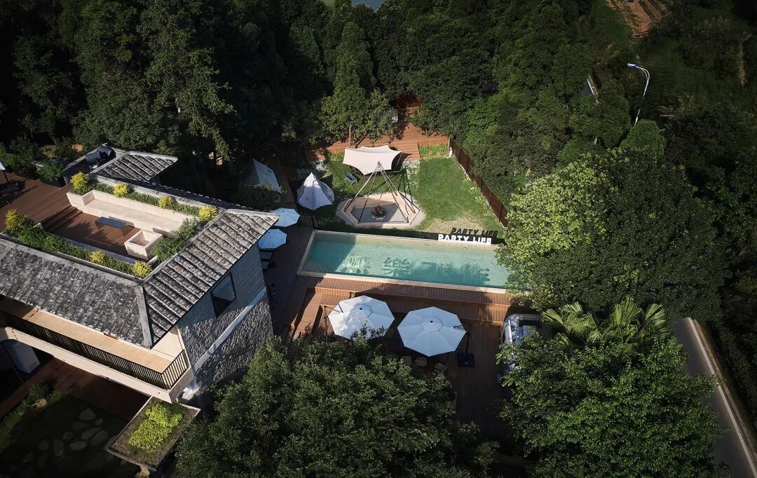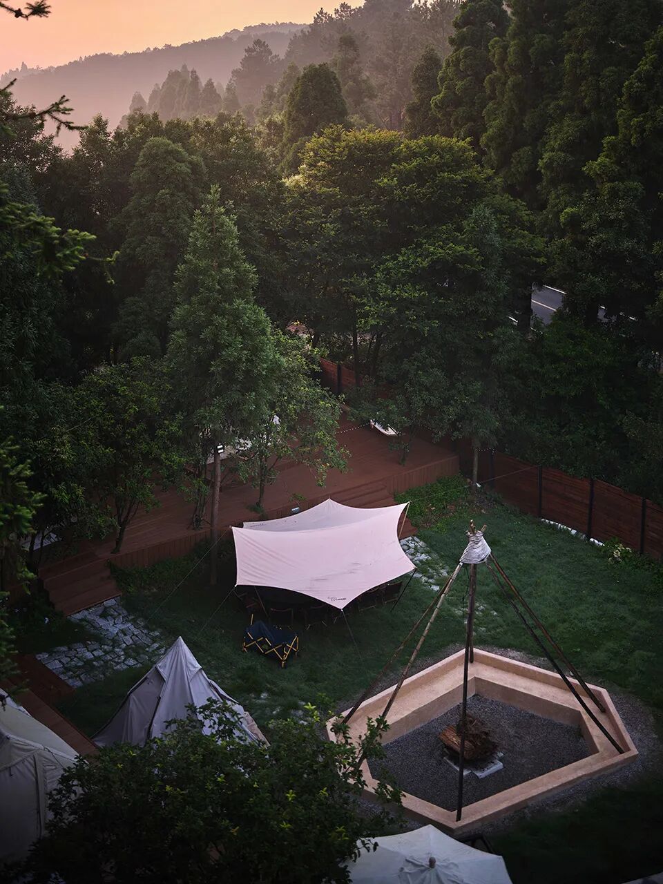 此用意在于院中这片绿其实是贯穿项目所有功能空间的纽带,咖啡厅、聚会区、客房、餐厅、泳池、外露营区……俯瞰之下,这些独立空间围绕着它,和谐连接,形成整齐。