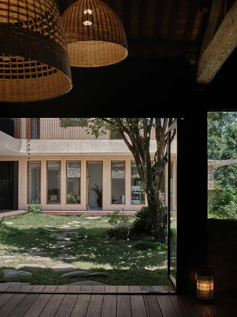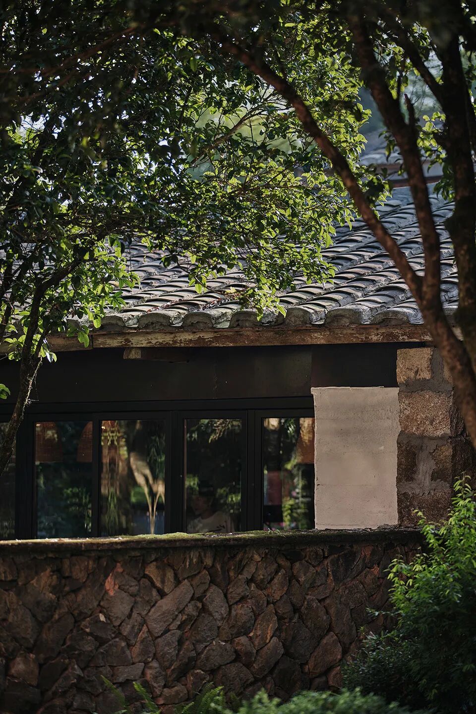 为更好地了解这栋建筑,设计师曾带上露营装备和电脑,于宅内餐厅待了四天三夜。即便民宿如今已营业近一年,他仍清晰记得在那期间的某日清晨,他穿着拖鞋,手持牙杯,蹲在院子里刷牙的情景:“抬眼望去,迷雾好像就在眼前,我肉眼可见的看它飘过去。再远处有梯田,还有无人整理的草地,绿油油地藏在薄雾里,让人想起那句‘青山掩映雾迷蒙,绿水凌波挽朔风’。”