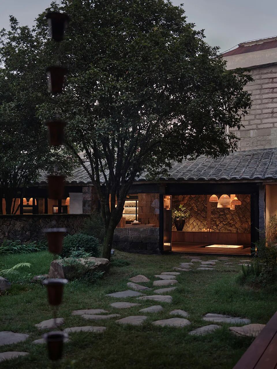 从咖啡厅走向内院,对院子的改造,设计在保留石墙外,只对院内绿植做了取舍。也保留高大的桂花树,清理杂乱无章的杂草,在院中铺上石板与小草。