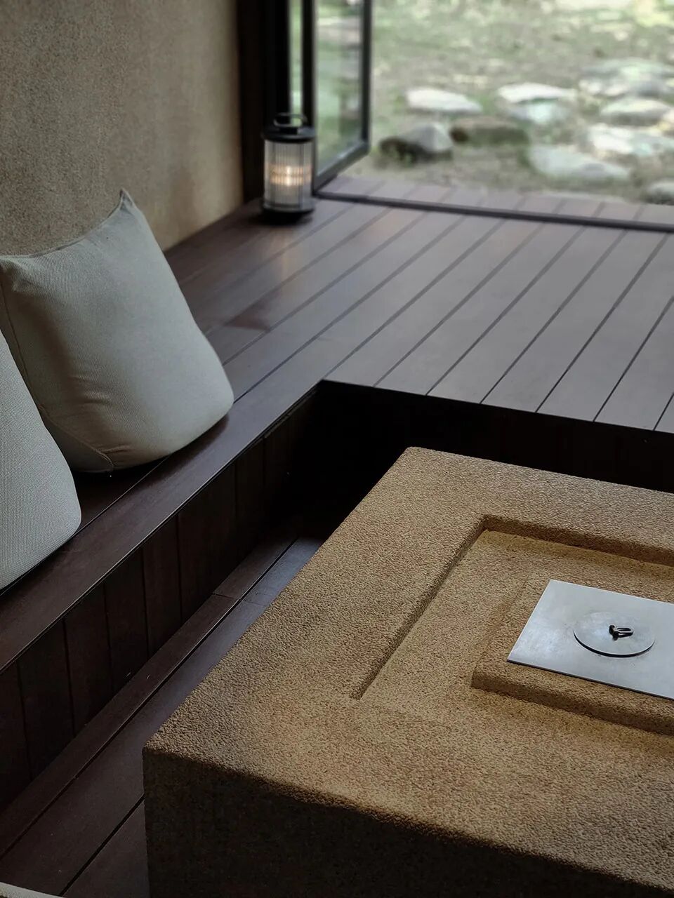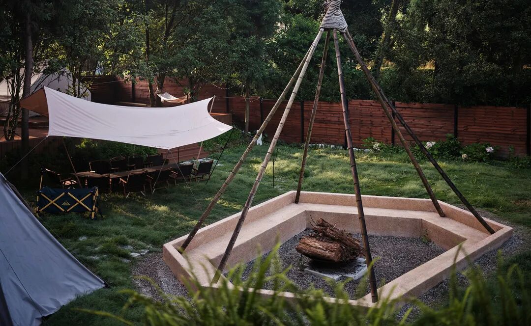 植物与流水总能给人带来熨帖人心的慰藉。而当夏天远走,寒冬即将来临时,设计师相信人们同样无法拒绝火焰带来的温暖。露营篝火区就藏着这样的心思,设计为人们安排好了一年四季。为保证温暖时光快乐无忧,设计先解决了篝火的安全问题。将烧柴区集中在中间,外延有框架隔离、保护,希望如此周全的设计,能让大家围坐在一起,安心的享受热烈篝火。相信那一刻人们不会只想着拍照发朋友圈,而是真正静下心,放下手机,感受当下。