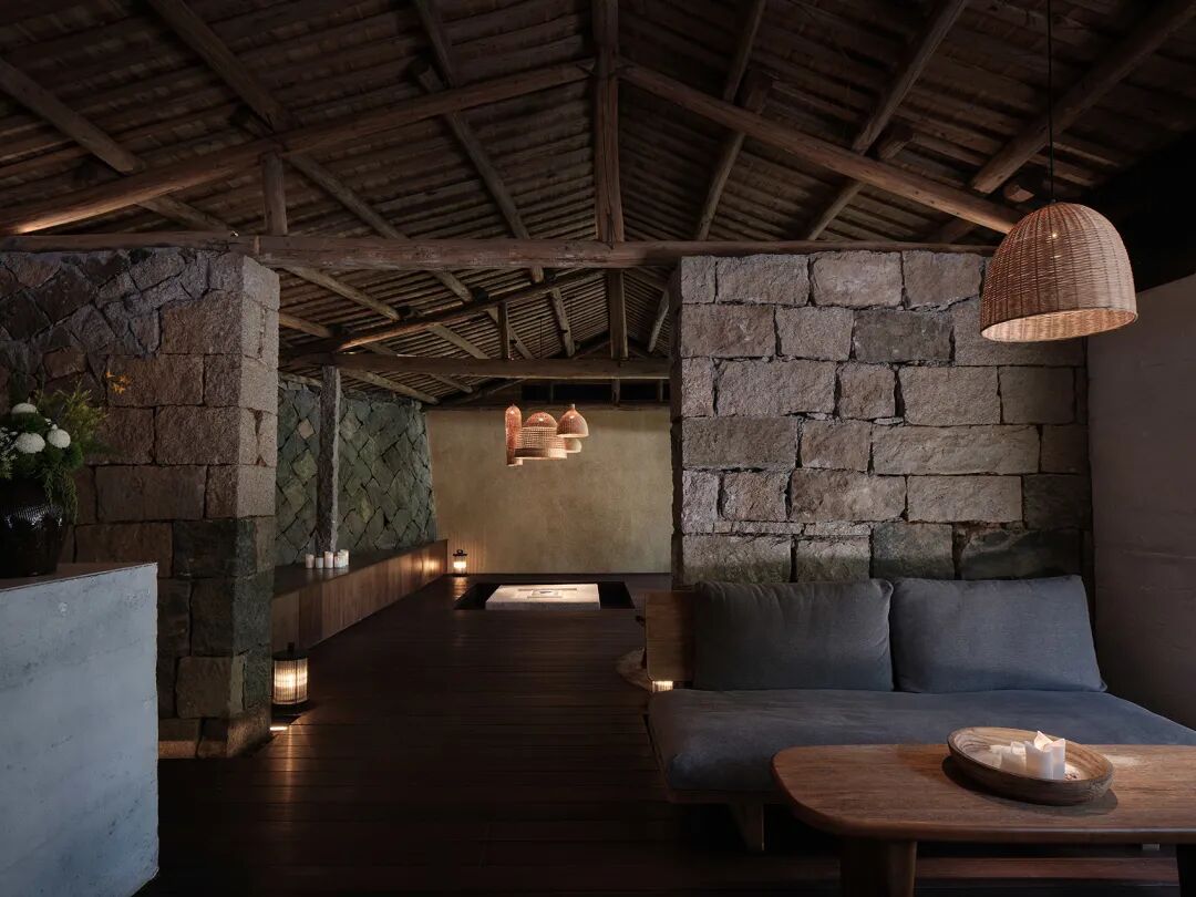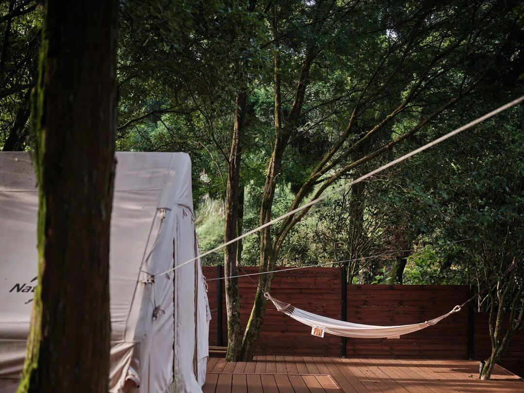 如客房里质朴而体贴入微的温馨设计;屋顶石座分布,供人享受鼓岭宽阔美景;从外露营区往深处走去,人们大概想不到那里还藏着温泉汤池;即使是咖啡厅里的插花装饰,设计师也特别建议择取鼓岭的自然植物即可。